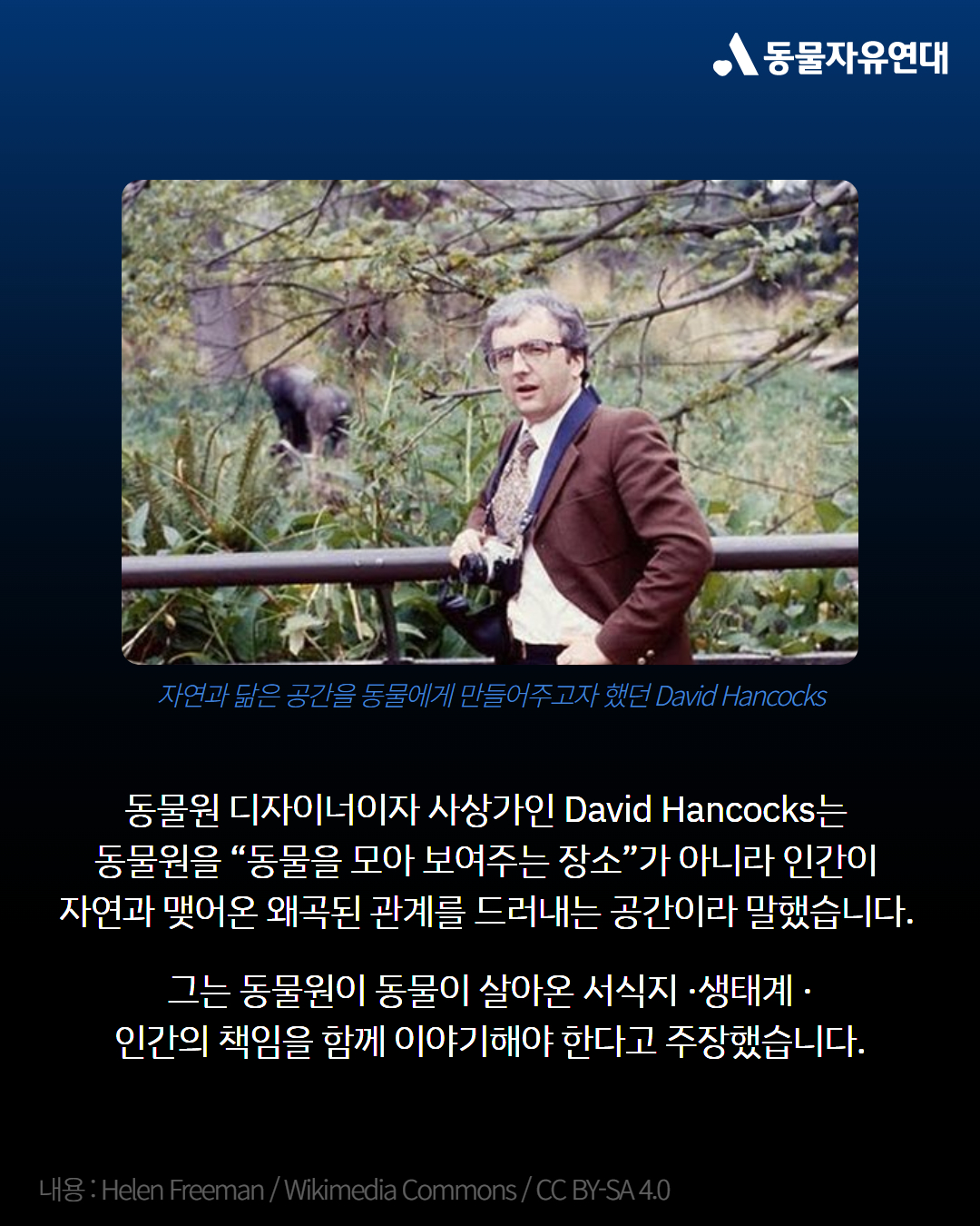 동물원 디자이너이자 사상가인 David Hancocks는 동물원을 “동물을 모아 (우표처럼 수집해) 보여주는 장소”가 아니라 인간이 자연과 맺어온 왜곡된 관계를 드러내는 공간이라고 말했습니다. 그는 동물원이 개별 동물을 관람의 대상이 아니라, 그들이 살아온 서식지·생태계·인간의 책임까지 함께 이야기해야 한다고 주장했습니다. 동물이 ‘보이지 않는 순간’조차 존중받는 환경, 그리고 동물원 밖의 야생을 보호하는 데 실질적으로 기여할 때에만 동물원은 존재할 윤리적 정당성을 가질 수 있다는 것입니다.