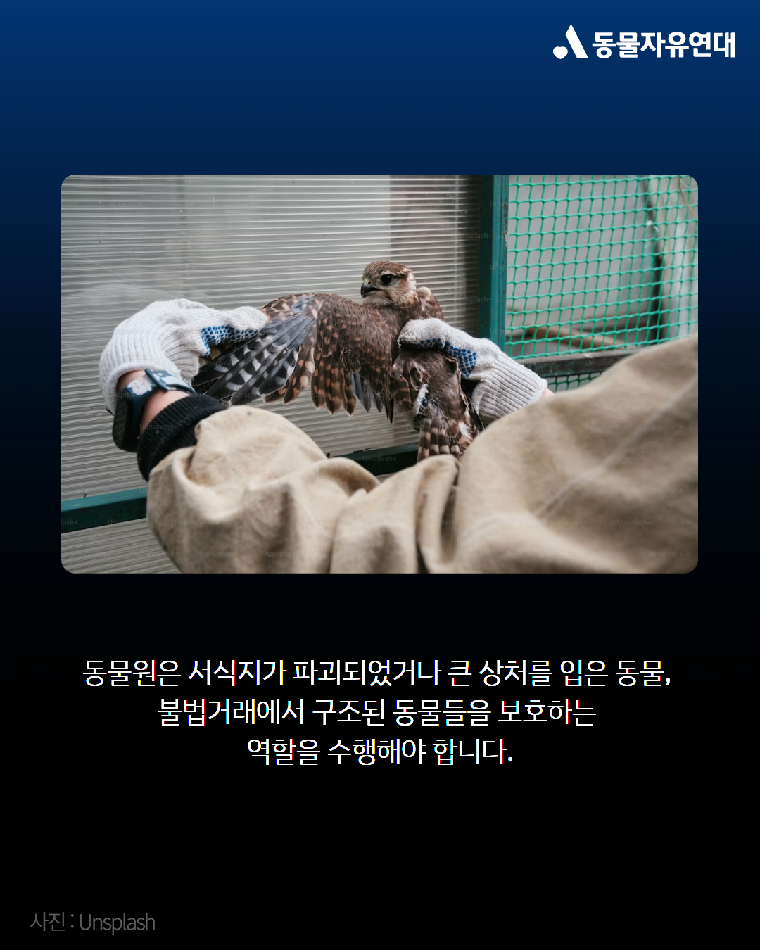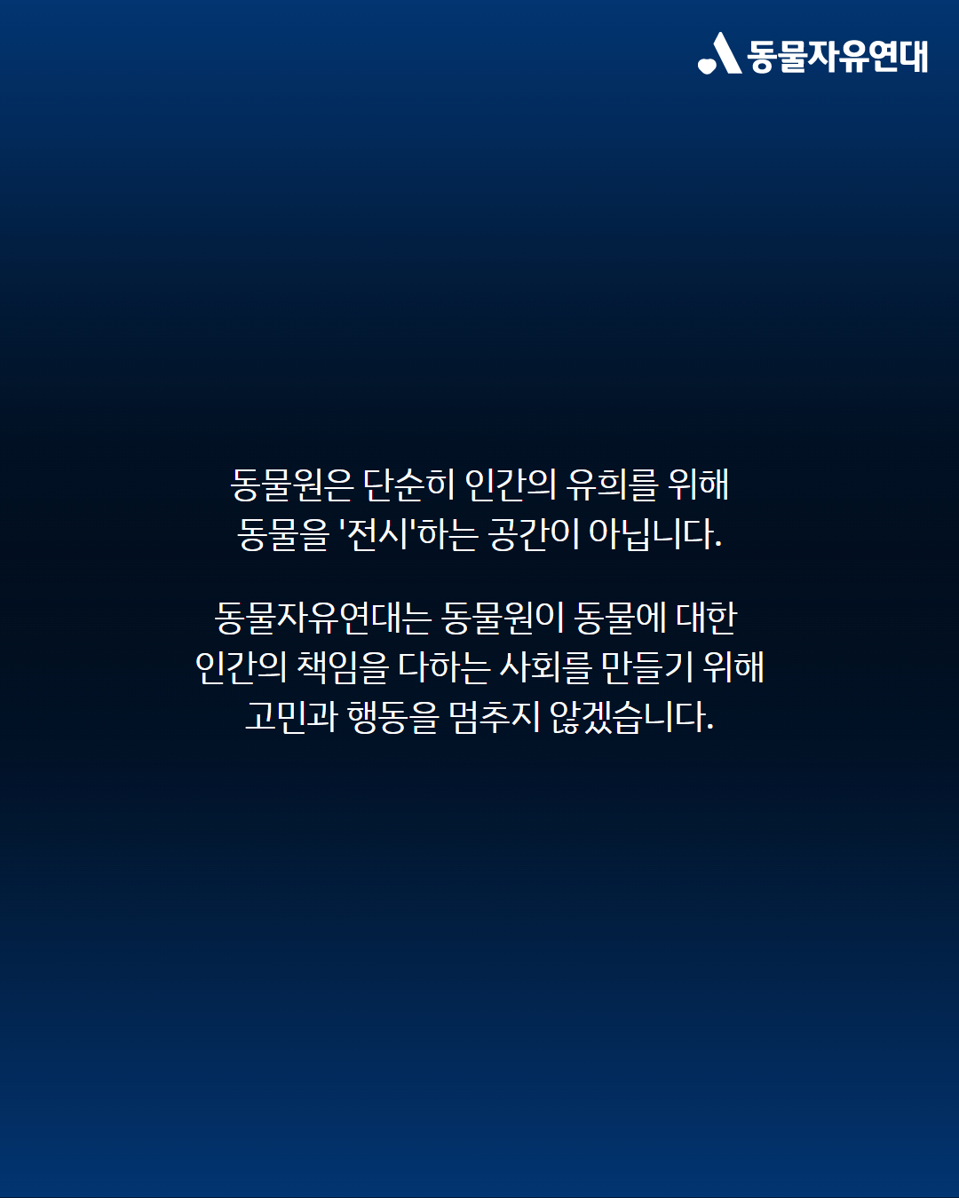 동물원은 단순히 인간의 유희를 위해 동물을 '전시'하는 공간이 아닙니다. 우리는 동물원의 정체성을 바꿔나가며 동물원을 인간 사회가 동물에게 지는 책임을 실천하는 곳으로 만들고, 언젠가는 동물원이 필요 없는 사회를 향해 나아가야 합니다. 동물자유연대는 동물원이 동물에 대한 인간의 책임을 다하는 사회를 만들기 위해 고민과 행동을 멈추지 않겠습니다.