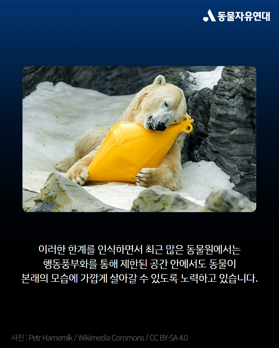 동물원에 있는 동물은 먹이와 물, 돌봄, 수의학적 처치를 제공받고 위험이 없는 환경 속에서 평균 수명보다 오래 살기도 합니다. 그럼에도 불구하고 자유, 생물학적 요구, 본능적 행동, 복잡한 사회성은 동물원의 제한된 환경에서는 결코 온전히 충족될 수 없습니다.
