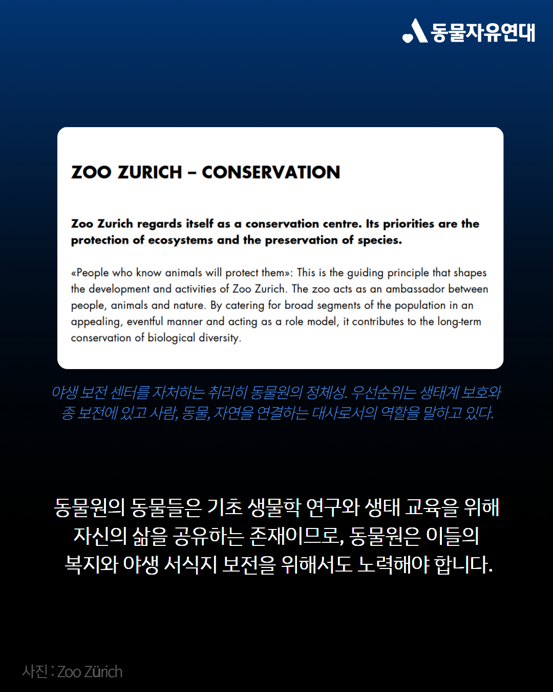 동물원은 야생에서는 관찰이 어려운 종의 기초 생물학을 연구해 야생 보전에 기여할 수 있는 공간입니다. 그러나 각 개체는 연구와 생태교육을 위해 자신의 삶을 공유해주는 존재이므로 동물원은 최고의 복지를 제공해야 합니다. 해외에서는 동물원이 문화· 관광·휴게시설이기보다 연구·보전·교육 기관이라는 법적 정체성을 가지고 있습니다. 이에 따라 단순 전시를 넘어서 야생 서식지 보전 프로젝트의 ‘자금·기술·인력 허브’를 운영하며 현장과 지속적으로 연결되는 보전 모델을 구현하고 있습니다.