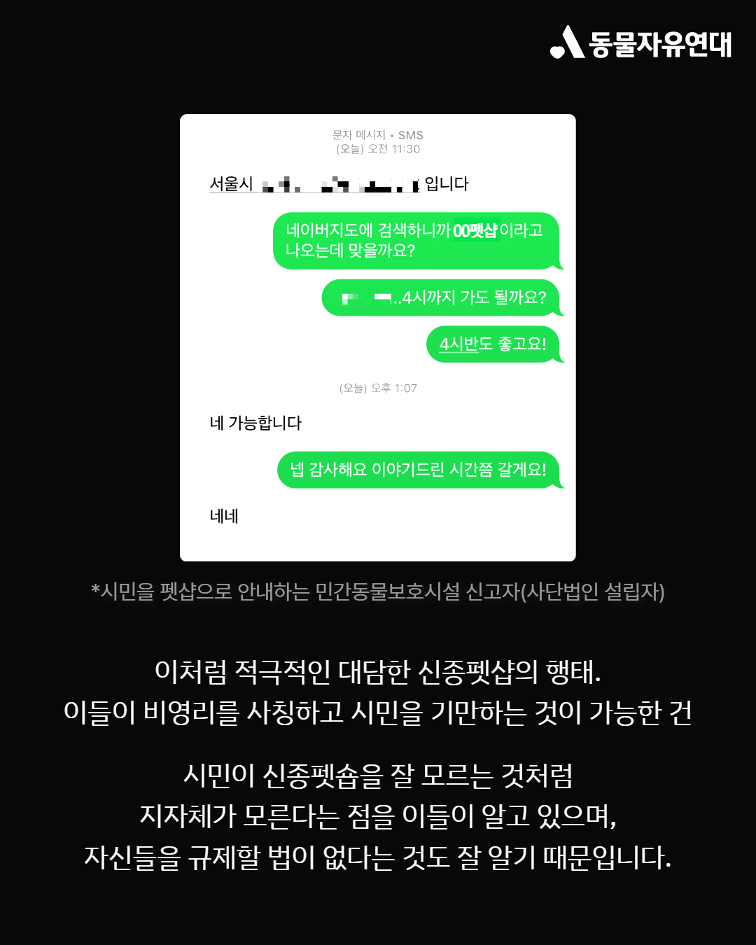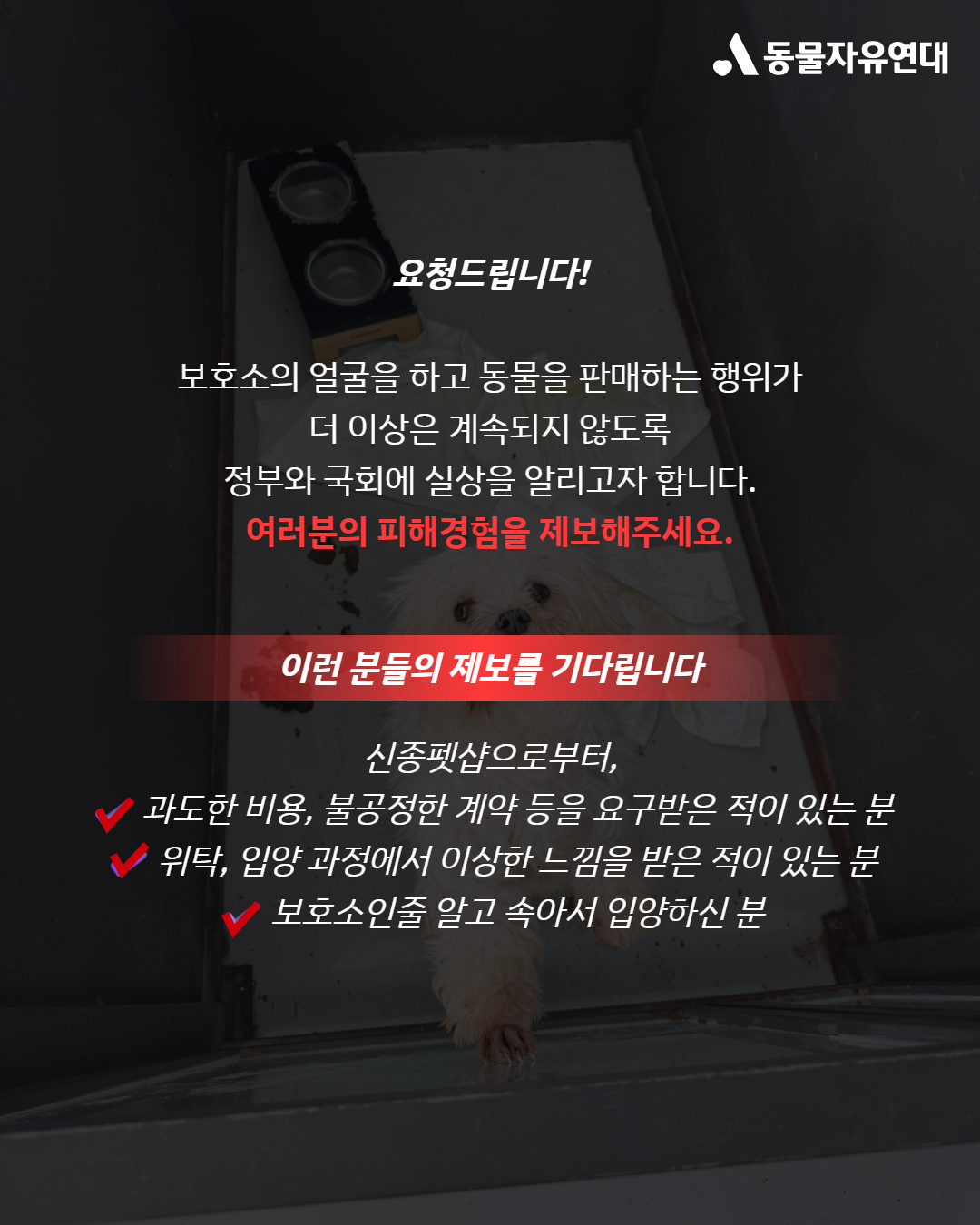 최근, 동물자유연대로 신종펫샵에 대해 문의하시거나 제보하시는 분들은 이전보다 늘었습니다. 전화하시는 모든 분들이 하시는 이야기는,