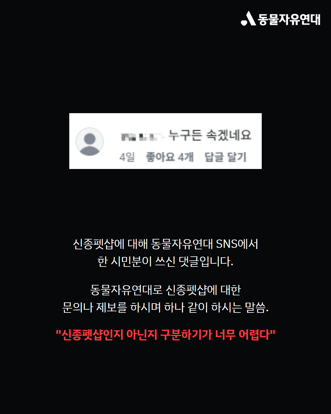 신종펫샵에 대해 동물자유연대 SNS에 시민님께서 다신 댓글입니다.