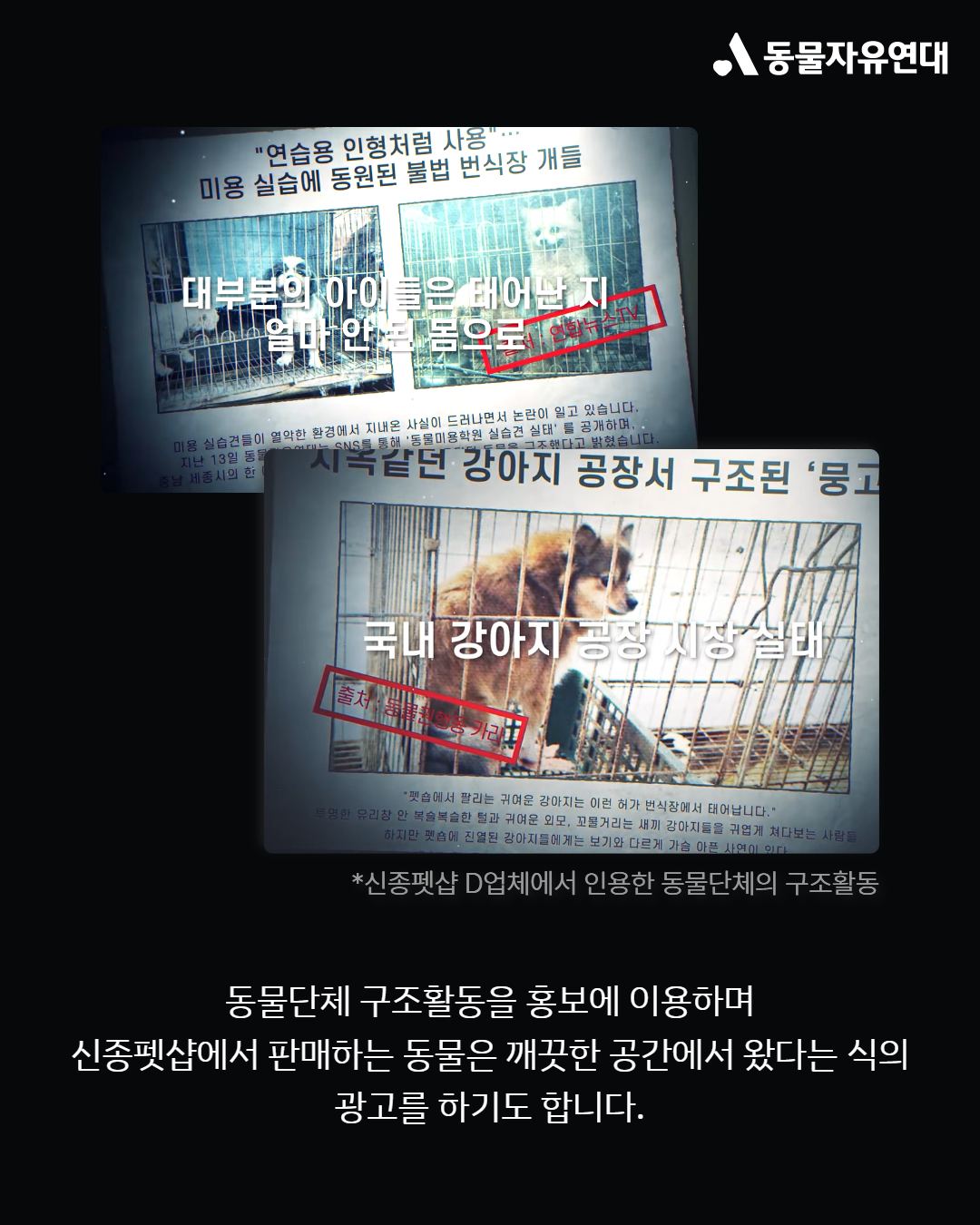 최근 신종펫샵의 ‘신분 세탁’은 꽤나 적극적입니다. 단순히 입양이나 보호소라는 표현을 쓰는 것을 넘어 사단법인 등록, 민간동물보호시설 신고, 지자체와 협력 심지어는 동물단체의 활동내용을 홍보에 활용하는 모습까지 보이고 있기 때문입니다. 신종펫샵 D업체는 동물자유연대를 포함한 동물단체들의 구조활동을 보여주며, D업체에서 판매되는 동물은 깨끗한 곳에서 태어났다는 식의 광고를 하고 있습니다.