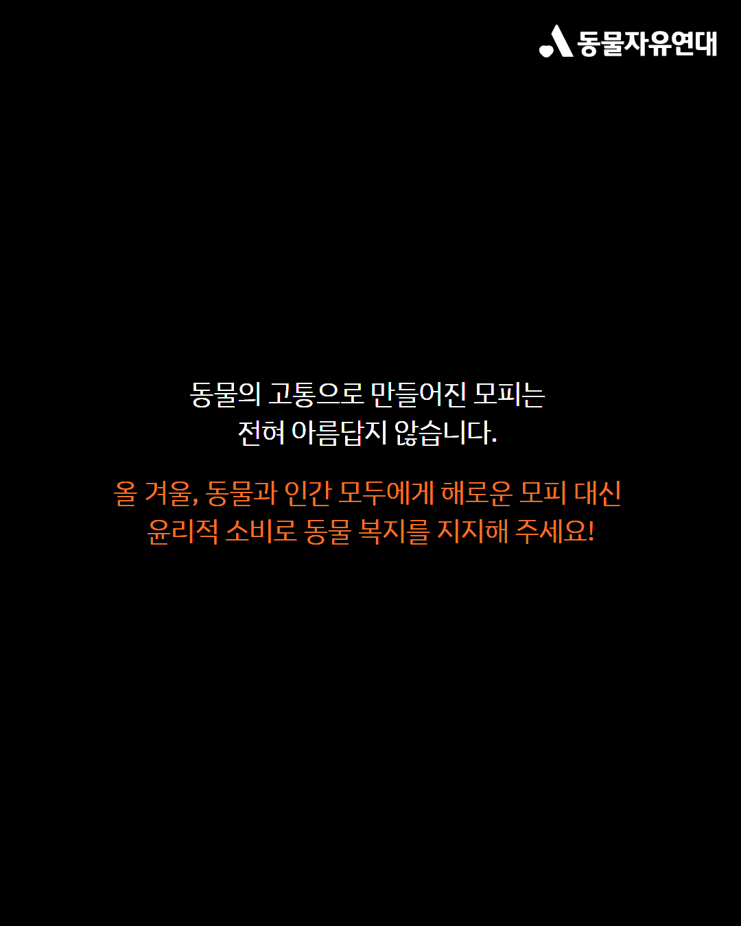 한국은 모피 농장은 없지만 다량의 모피를 가공하는 공장이 있고 모피 제품 수출입이 활발히 이뤄지고 있습니다. 동물의 고통으로 만들어진 모피는 전혀 아름답지 않습니다. 올 겨울, 동물과 인간 모두에게 해로운 모피 대신 윤리적 소비로 동물 복지를 지지해 주세요!