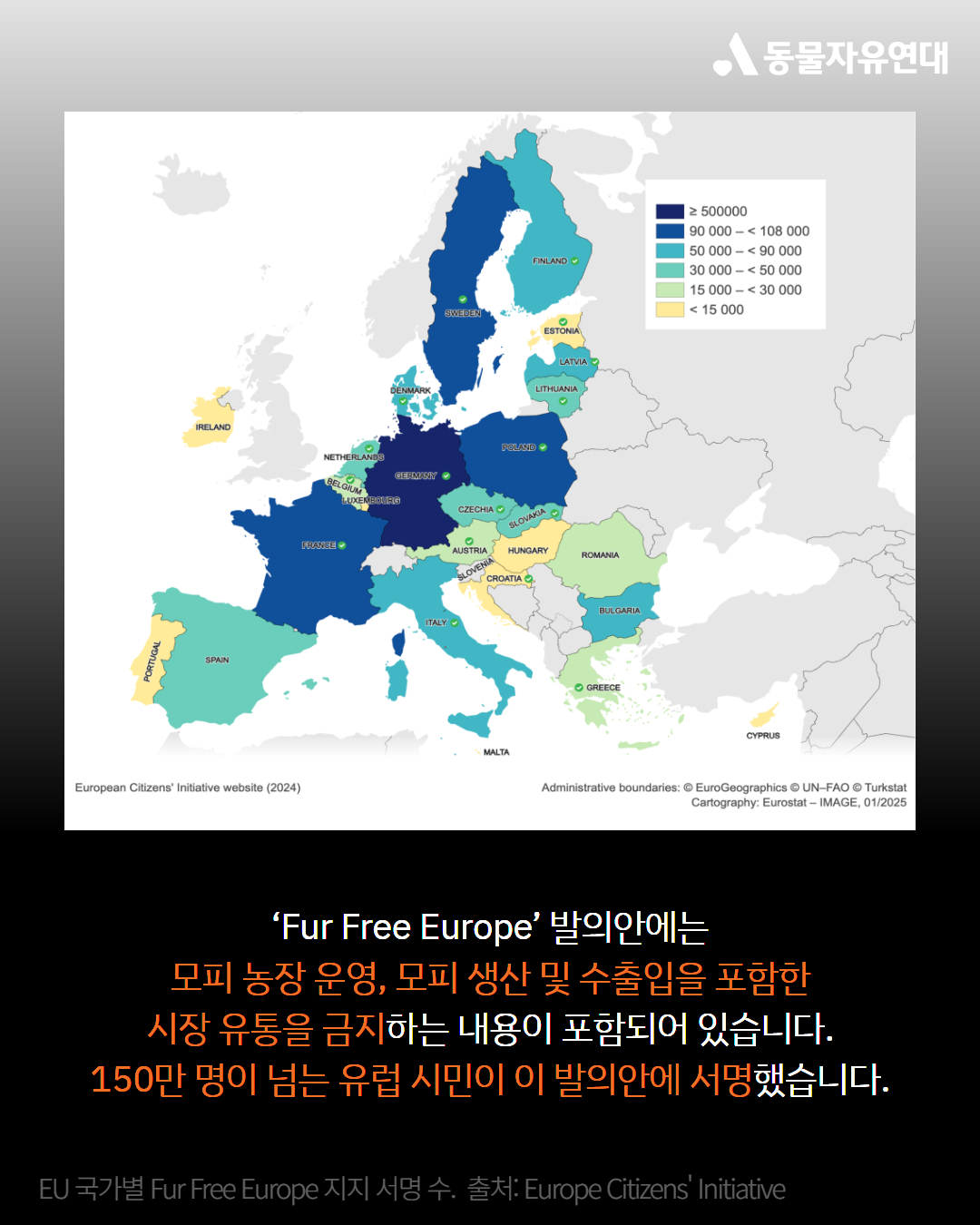 2023년 6월에는 유럽연합 집행위원회에 ‘Fur Free Europe’이라는 시민 발의안이 제출되었습니다. EU 시민 발의 제도는 EU 7개국 이상에서 시민 100만 명 이상의 서명이 모이면 법안을 제안할 수 있는 제도입니다.