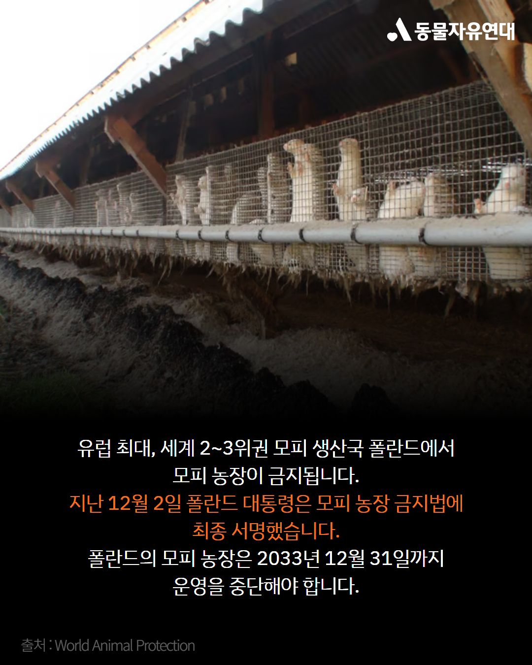 유럽 최대, 세계 2~3위권 모피 생산국 폴란드에서 모피 농장이 금지됩니다. 지난 12월 2일 폴란드 대통령은 모피용 동물 사육 금지법에 최종 서명했습니다. 폴란드는 8년 동안 유예기간을 두어 모든 모피 농장은 2033년 12월 31일까지 운영을 중단해야 하며, 2031년까지 폐업하는 농장에 대해서는 보상제를 실시합니다.