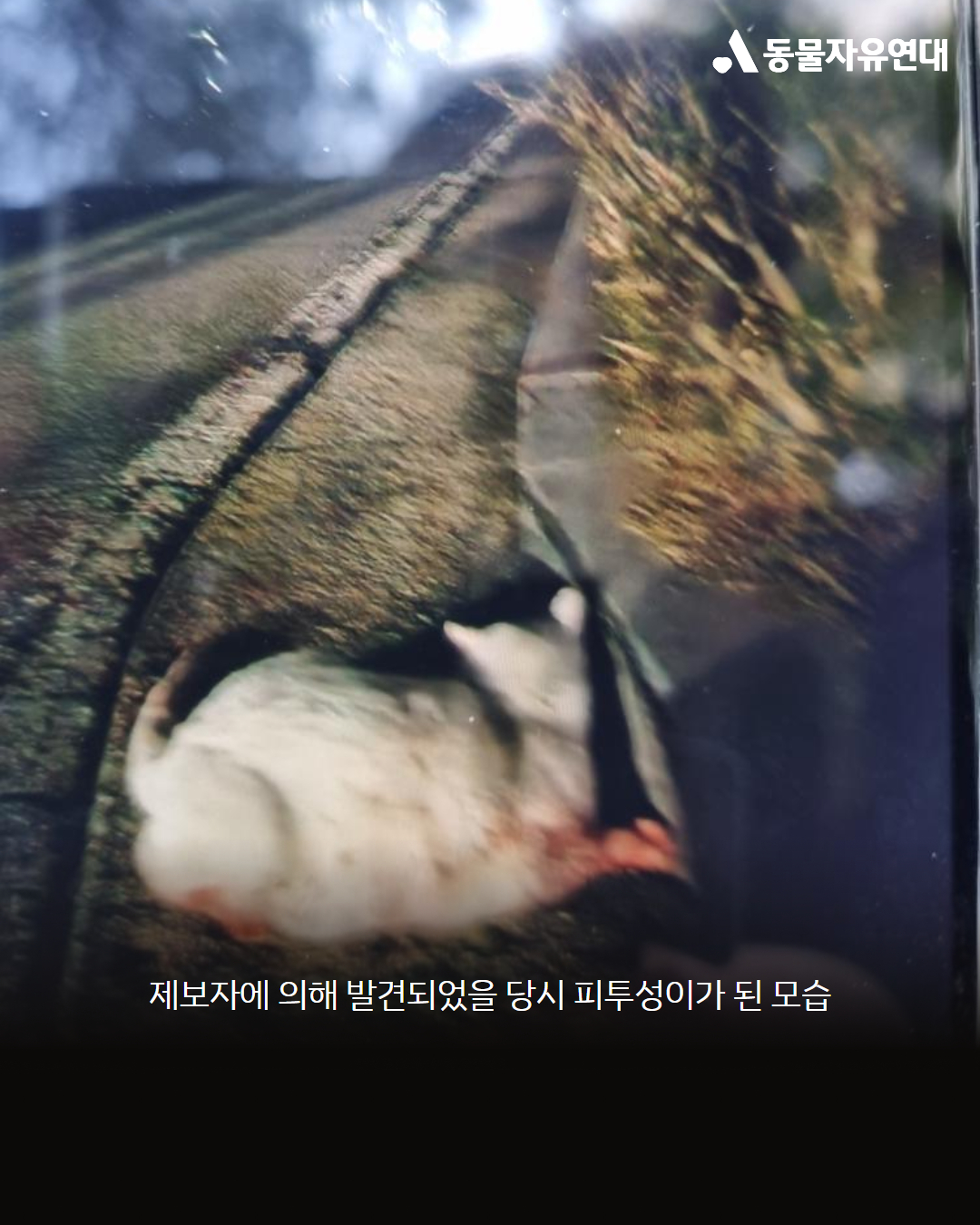 동물자유연대 활동가들이 급히 현장으로 달려갔을 때, 아파트 주차장 바닥에는 피가 번져 있었고, 고양이는 거의 움직이지 못한 채 은신한 상태였습니다.