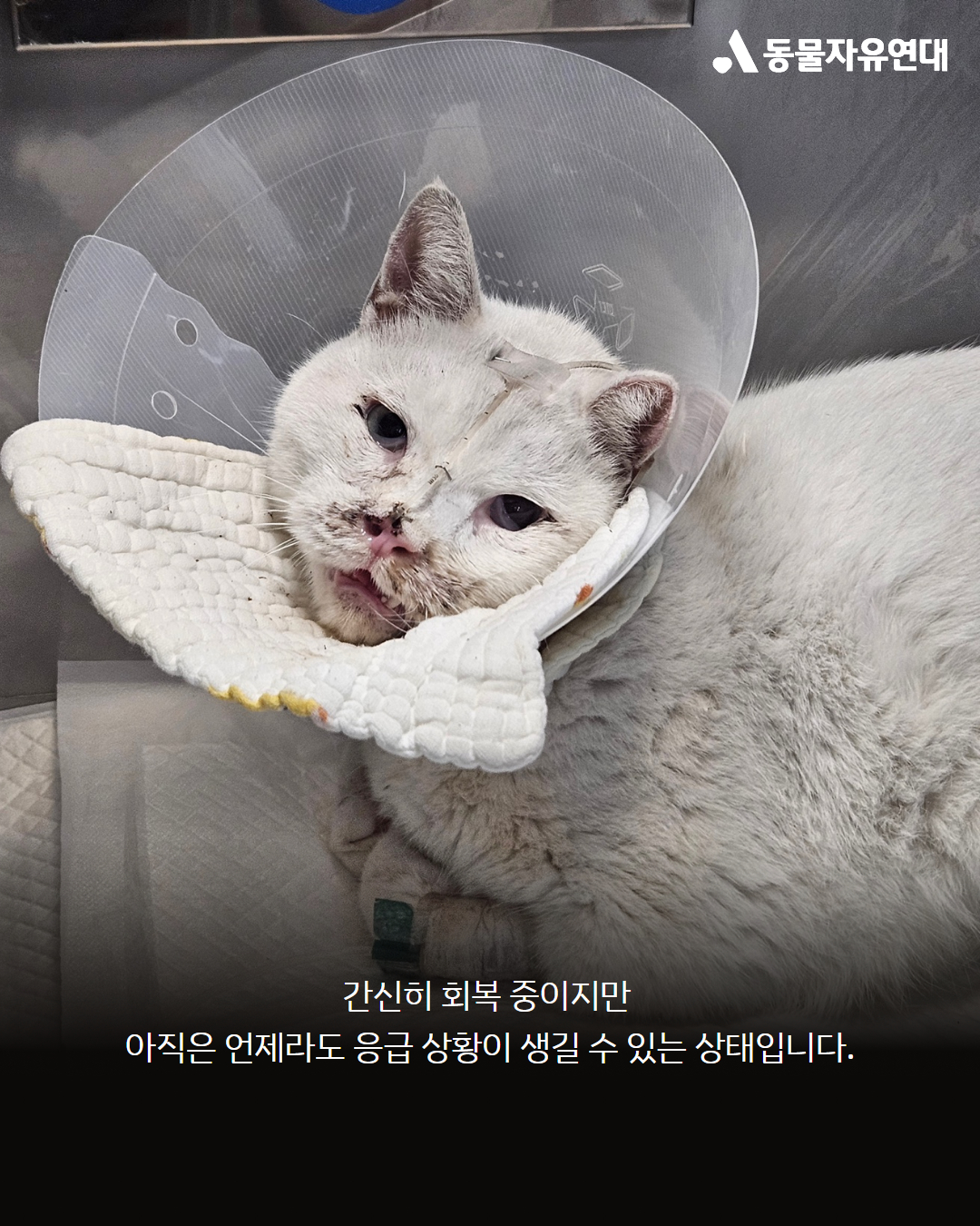 무엇보다도 고양이가 하루빨리 회복할 수 있도록 여러분의 따뜻한 응원과 관심이 절실합니다. 작은 생명을 향한 사랑이 또 한 번의 기적을 만들 수 있도록 함께 마음을 모아주세요.