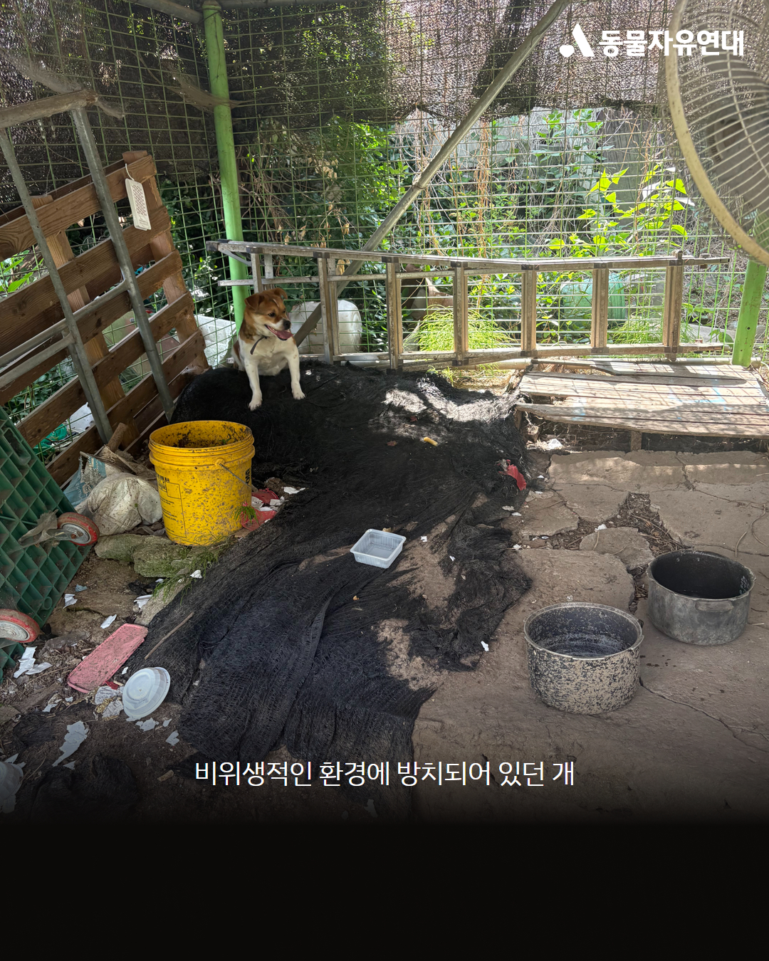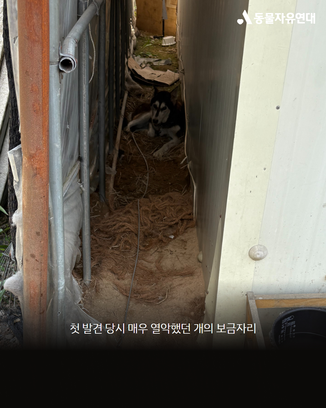 현장에는 총 2마리의 개가 각각 다른 장소에서 줄에 묶이고 철제 울타리 안에 가둬진 채 사육되고 있었습니다.