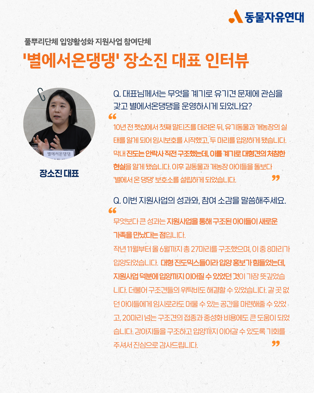 '별에서 온 댕댕' 장소진 대표는 "구조견 대부분이 대형 진도믹스견들이라 입양이 어려웠는데, 지원사업으로 입양을 진행할 수 있었다. "정말 뜻깊었다"고 말했습니다.