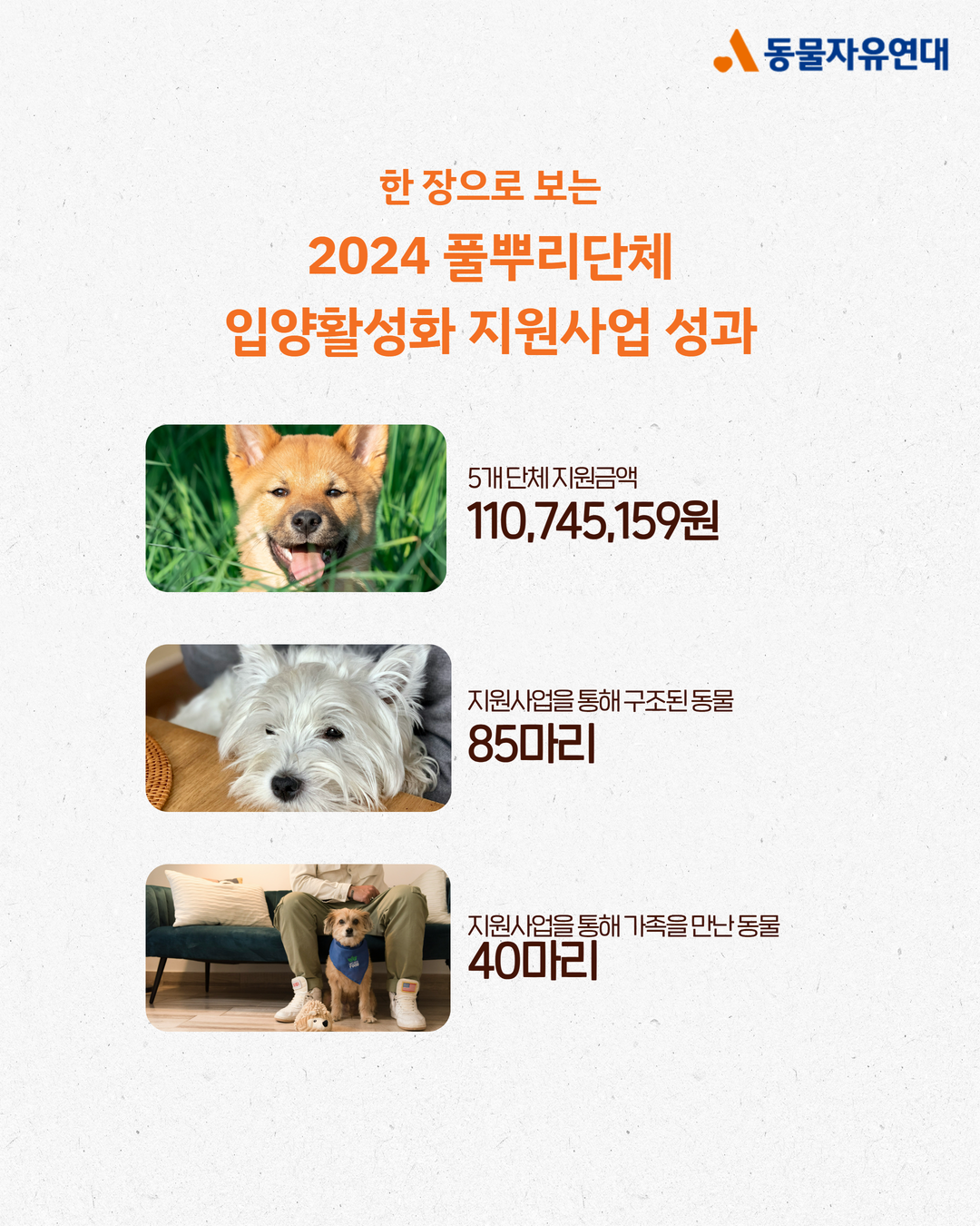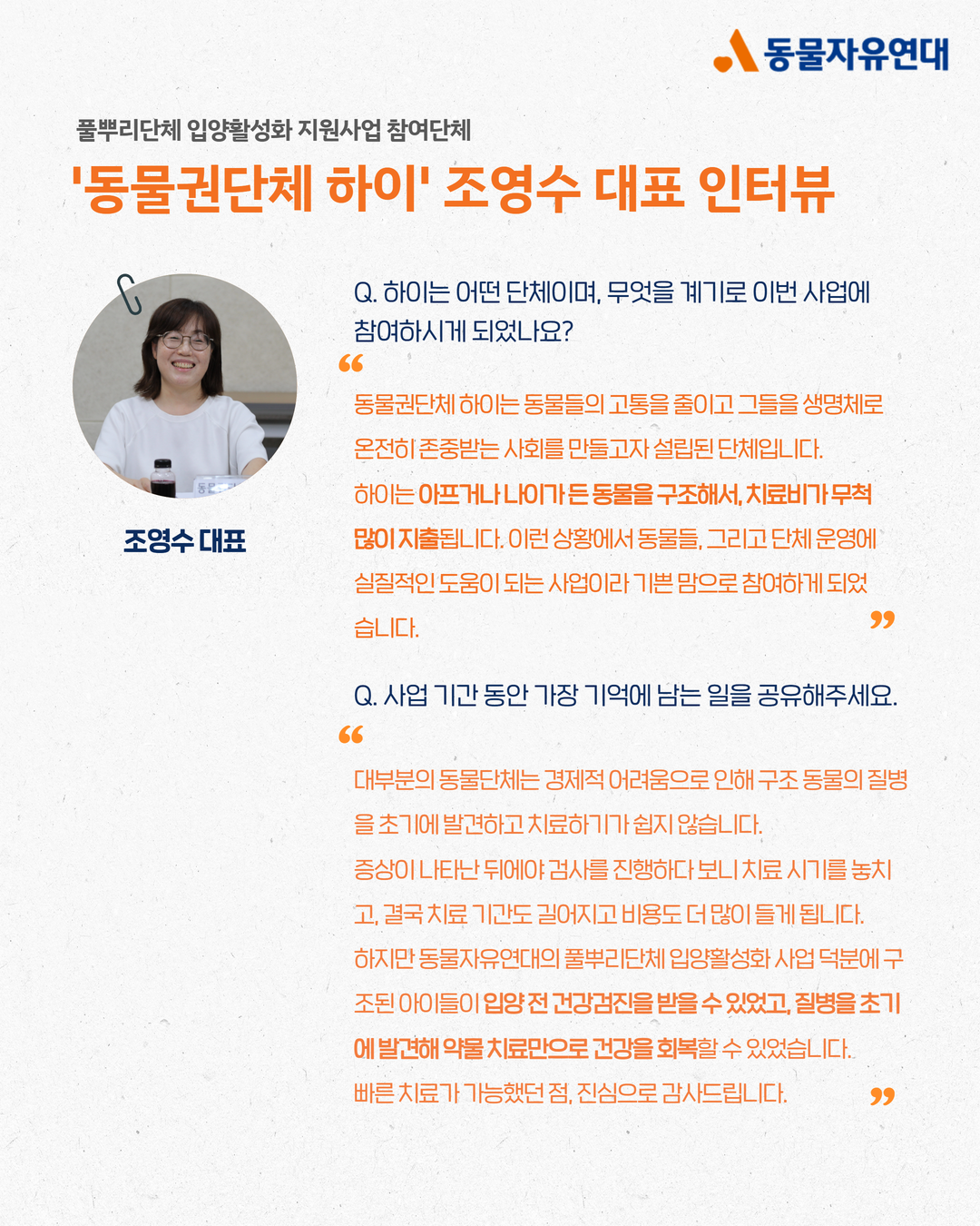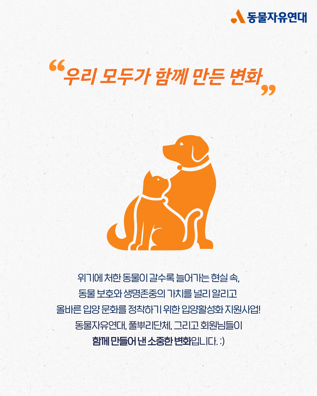무엇보다 입양 활성화 지원사업은 회원 여러분의 든든한 지지와 후원이 있었기에 가능했습니다. 동물자유연대는 앞으로도 현장의 목소리를 반영해 지원사업을 운영하고, 의미있는 변화를 만들어내겠습니다.