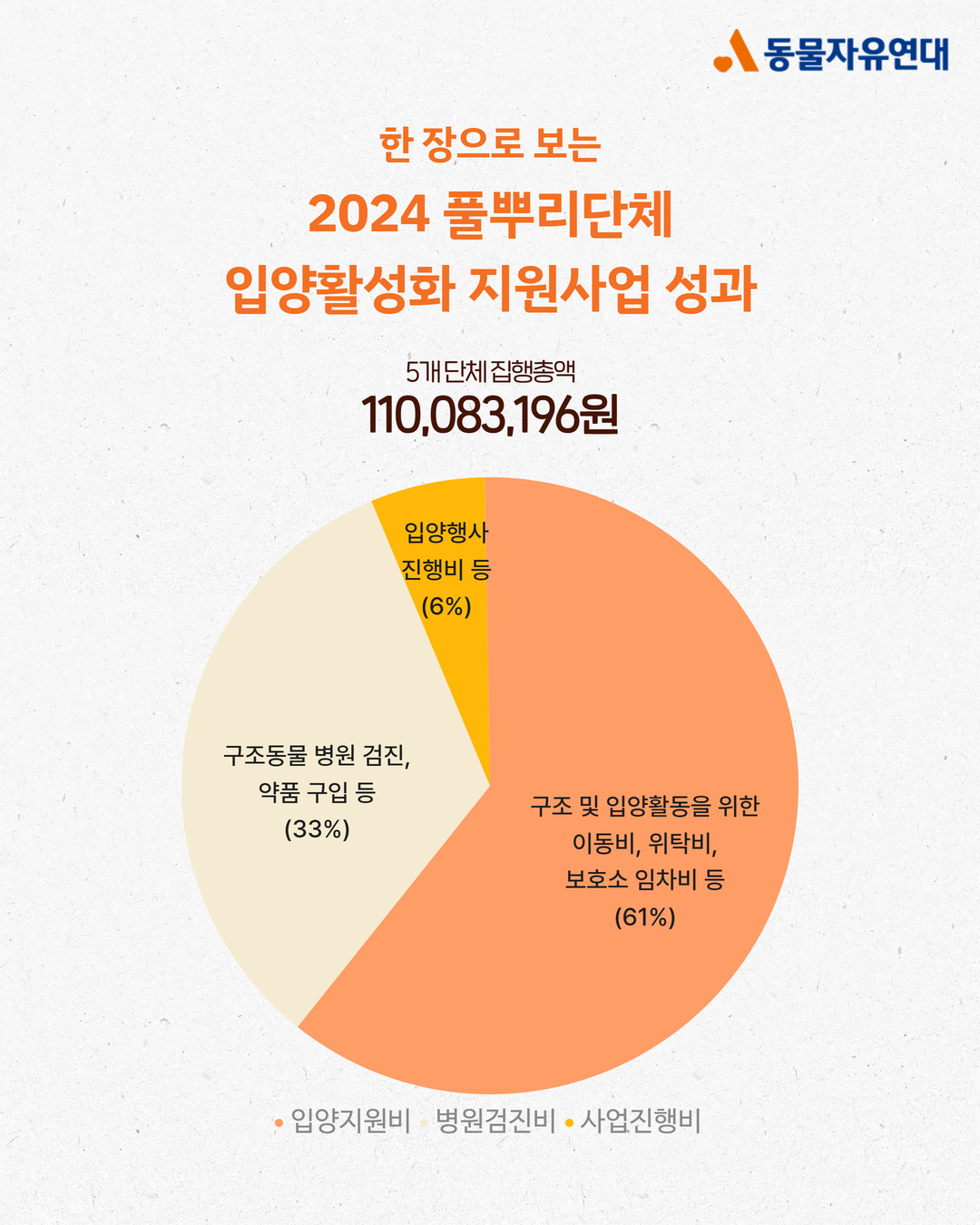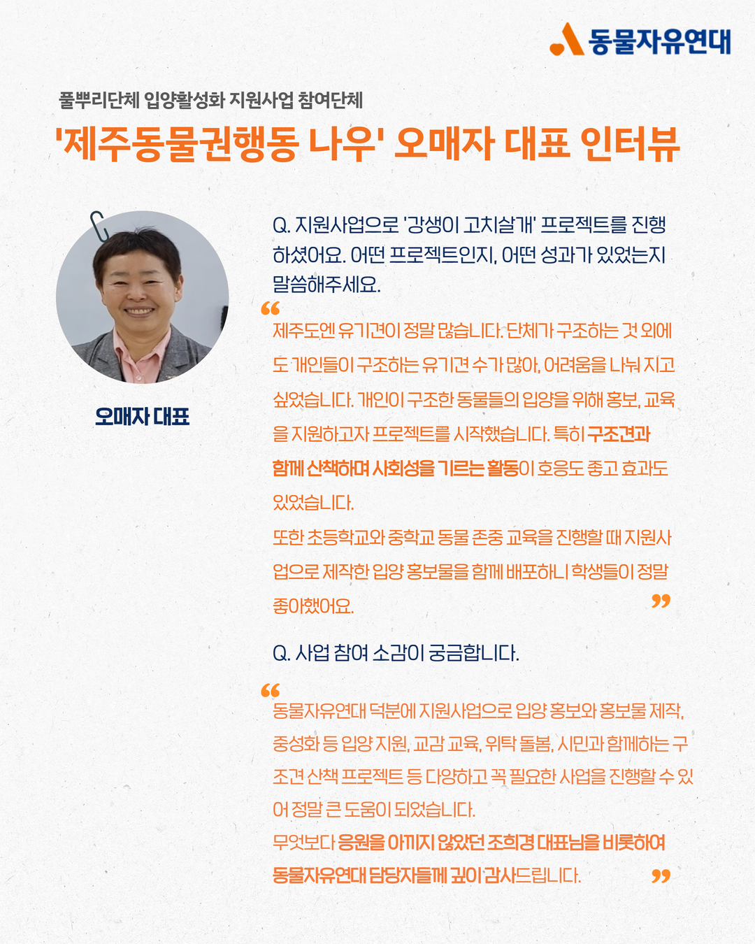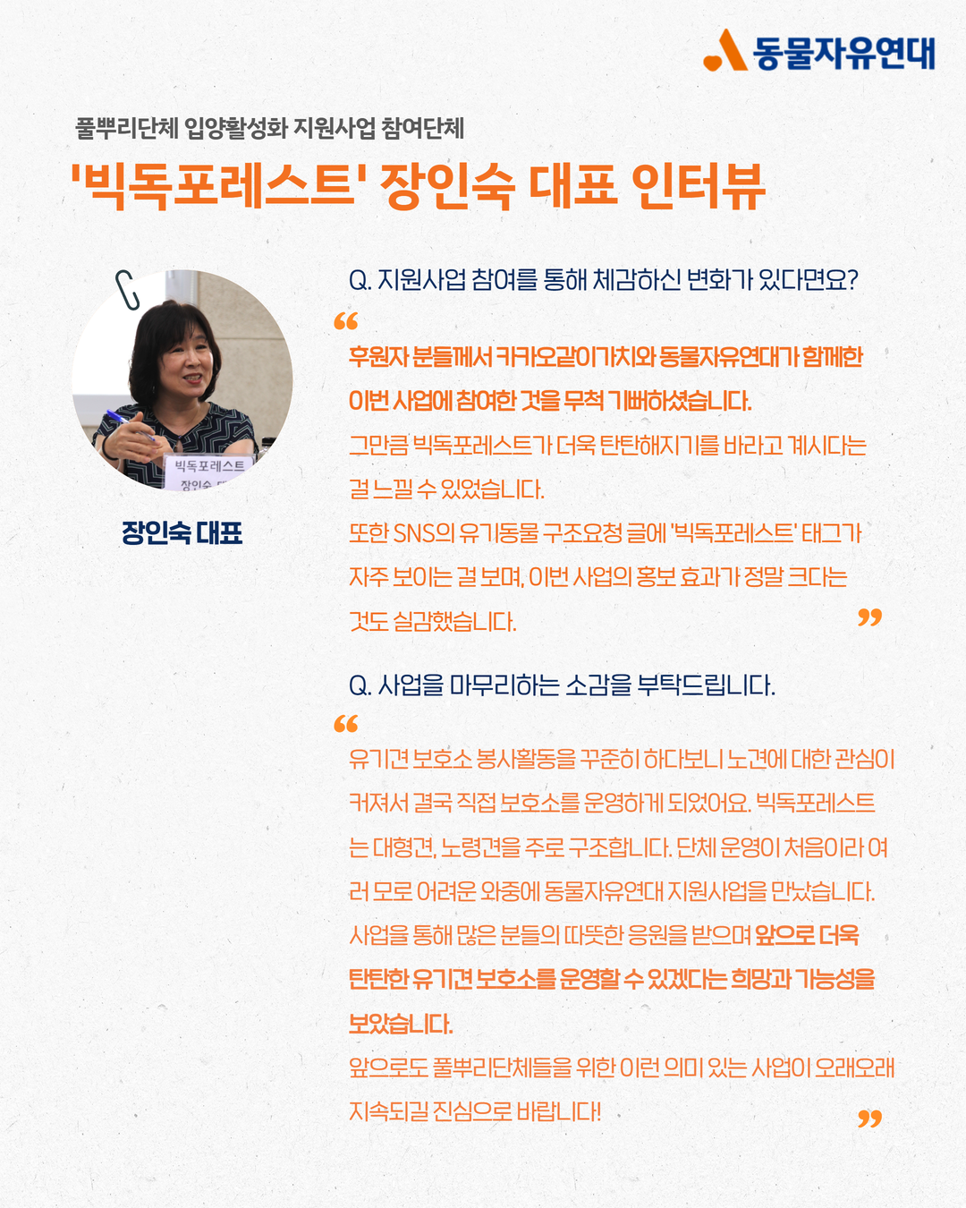 무엇보다 입양 활성화 지원사업은 회원 여러분의 든든한 지지와 후원이 있었기에 가능했습니다. 동물자유연대는 앞으로도 현장의 목소리를 반영해 지원사업을 운영하고, 의미있는 변화를 만들어내겠습니다.