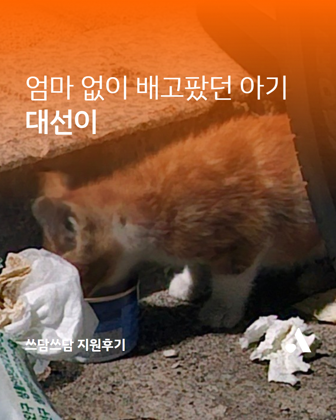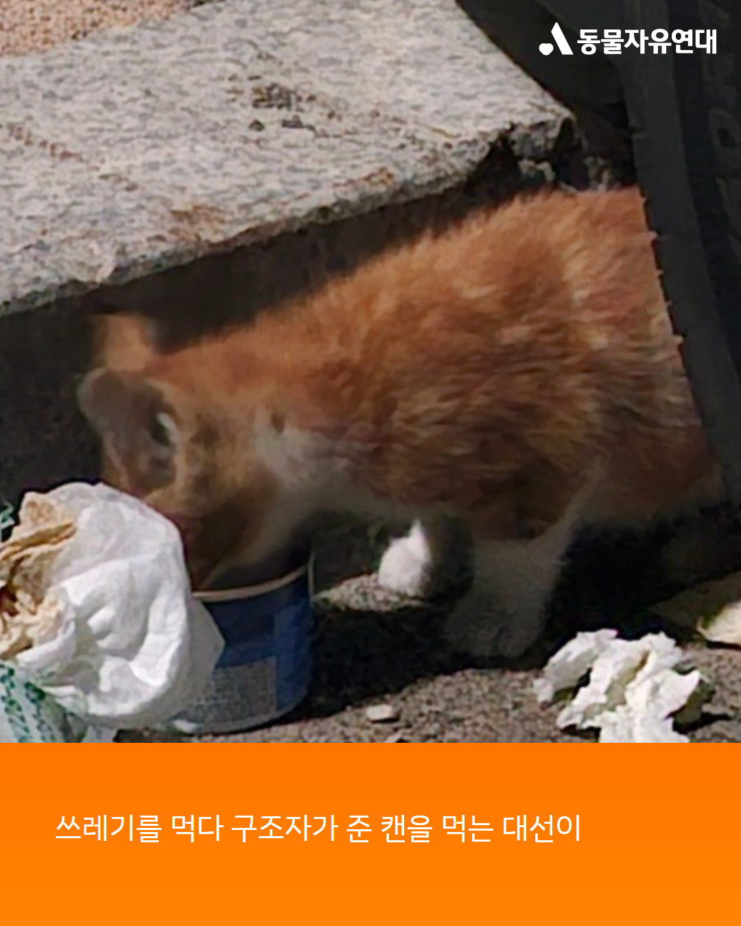 손을 뻗어 살짝 만져 보려고 했는데 아기고양이는 재빨리 도망갔습니다. 그래도 손은 타지 않은 것 같아 다행이라고 생각하고 밥만 챙겨주자 생각했습니다. 그 후부터 쓰레기봉투를 뜯고 쓰레기를 먹지 말라고 아기고양이용 사료와 물 그리고 캔을 매일 챙겨주었습니다. 대통령 선거 날 만났으니 이름은 ‘대선이’라고 지었습니다.