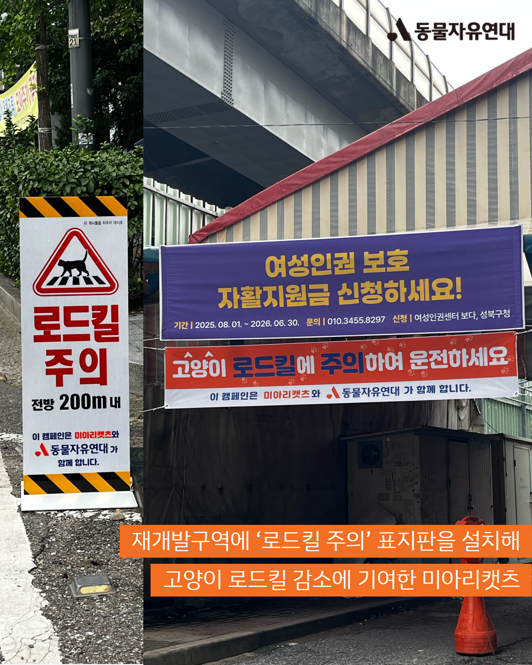 재개발 구역 일대에 ‘로드킬 주의’ 표지판을 설치해 고양이의 안전을 지키고 있습니다.