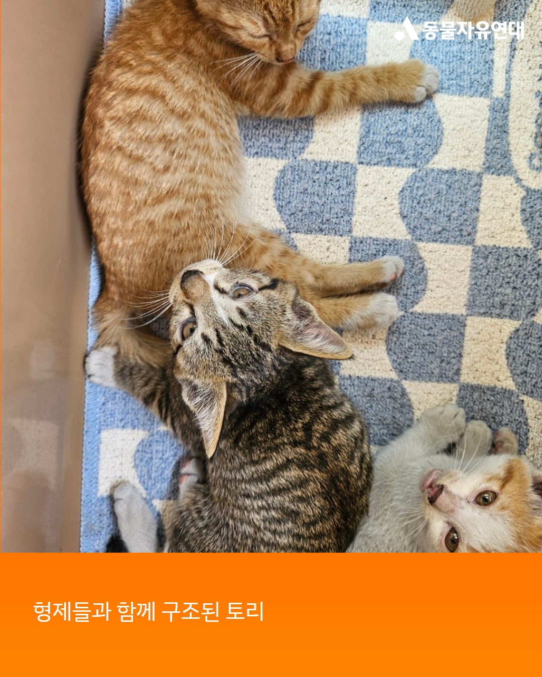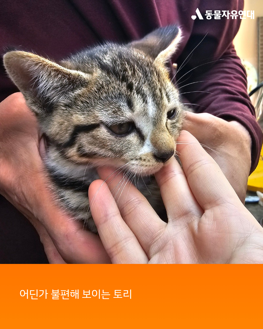 가족 모두 동물을 사랑하는 구조자는 반려묘 세 마리 모두 구조한 고양이들로 키우고 있었습니다. 한 이웃이 공장에 삼색 고양이가 들어와서 새끼를 네 마리를 낳고 살았지만 사람들이 싫어해서 공장 바로 옆에 집을 만들어 새끼들과 밥을 먹으며 살게 했는데, 아기고양이 한 마리가 시름시름 앓다가 고양이별로 떠나고 남은 세 마리 아기고양이도 설사를 하고 걱정되어서 한 마리라도 데려가 달라고 연락해 왔다고 했습니다. 이웃은 반려동물을 키울 수 없어 입양 갈 때까지 구조자가 보호해 줄 수 있는지 부탁했습니다. 아가들도 안쓰러웠고 안타까운 사정에 거절할 수가 없었습니다. 구조자는 세 아이 중 토리를 데려왔습니다.