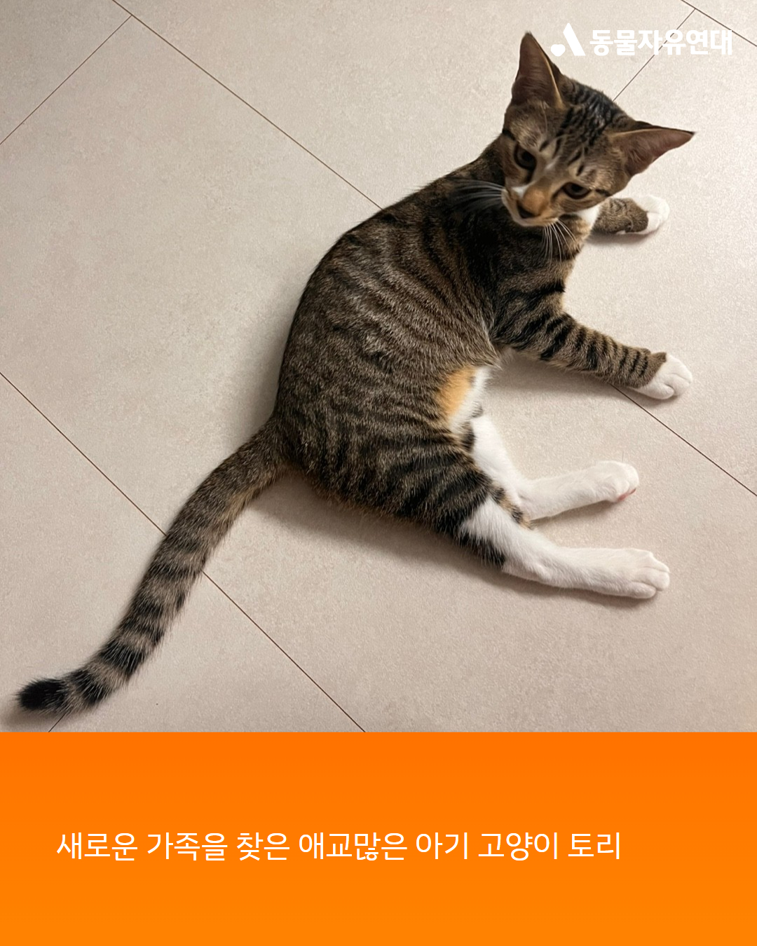 토리는 성격 좋은 애교냥이가 되어 갔습니다. 사람을 보면 야옹거리며 반기고, 무릎에 올라오고, 자려고 누우면 옆에 얌전히 눕는 사랑스러운 아이가 되었습니다. 입양이 오래 걸릴 거라 생각했지만 입양자는 성격 좋고 애교 많은 토리를 보고 한눈에 반해 입양했습니다. 형제들이랑 잘 지냈던 경험 때문이었는지 토리는 입양된 곳에서 합사도 잘 이루어졌고 적응도 잘 했습니다.