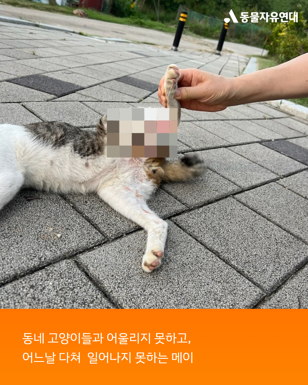 며칠간 보이지 않던 메이가 어느 날 저녁 다시 보였는데 힘없이 쓰러져 있었고 간식을 주어도 먹지 않고 구조자만 바라보았습니다. 다리를 확인해 보니 허벅지에 깊은 상처가 나 피부 손상이 심하고 속살과 근육, 뼈까지 드러난 심각한 상태였습니다.