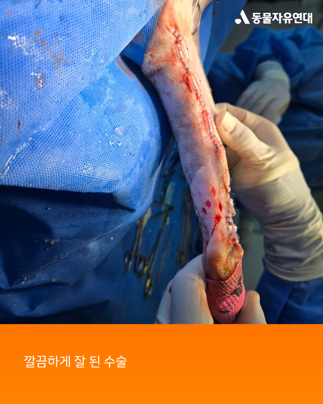 수의사 선생님은 상처가 며칠 전 생긴 것으로 보이며, 다행히 더위 속에서도 구더기가 생기지않아 수술이 가능하다고 했습니다. 하지만 곧바로 봉합은 어렵고 먼저 상처 부위가 단단해져야 한다고 했습니다. 약 2주간 집중 치료를 거쳐 봉합 수술을 할 수 있었고, 이후에도 감염 위험이 높아 한달 이상 입원 치료를 이어 갔습니다.