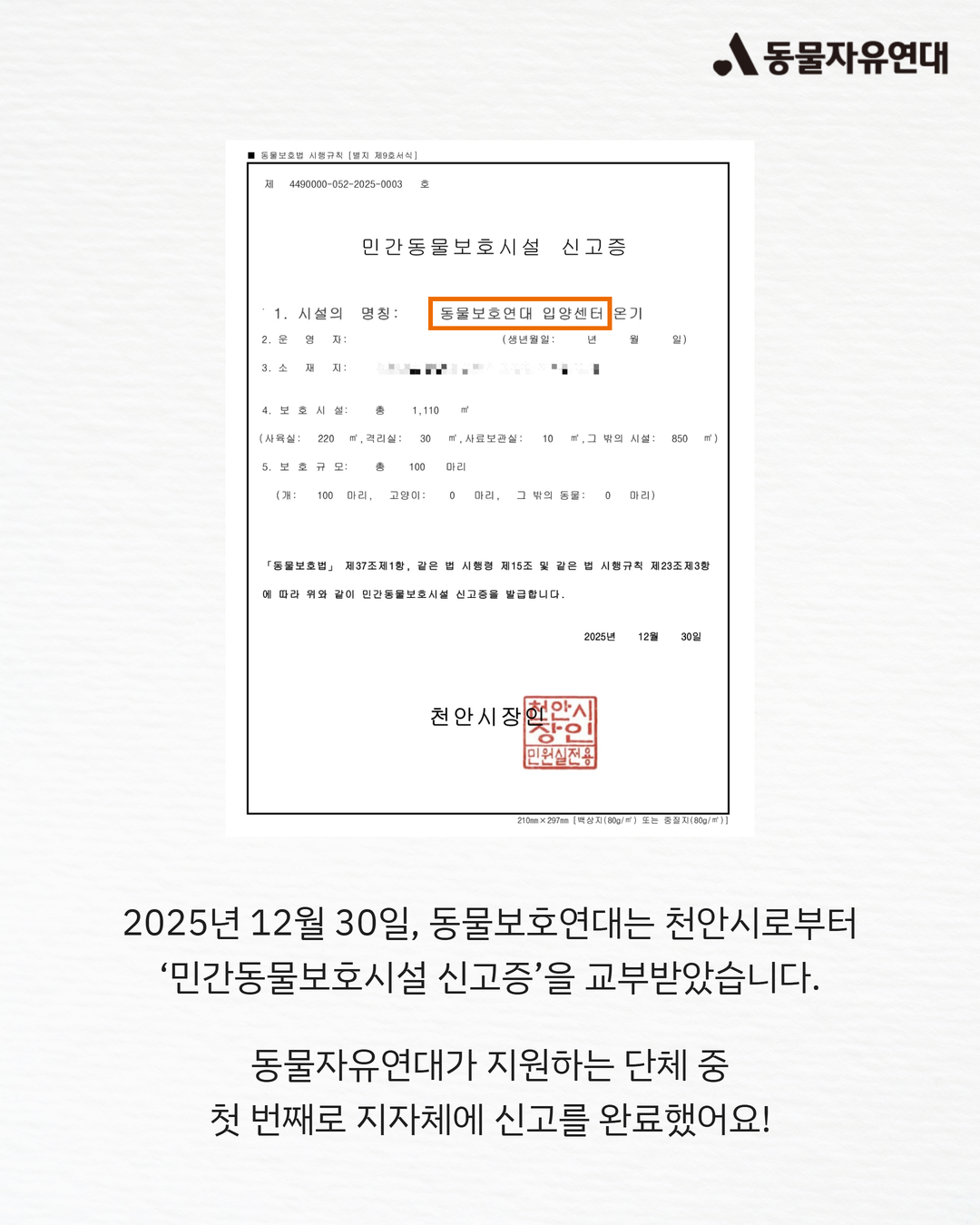 천안시로부터 ‘민간동물보호시설 신고증’을 교부받았습니다.