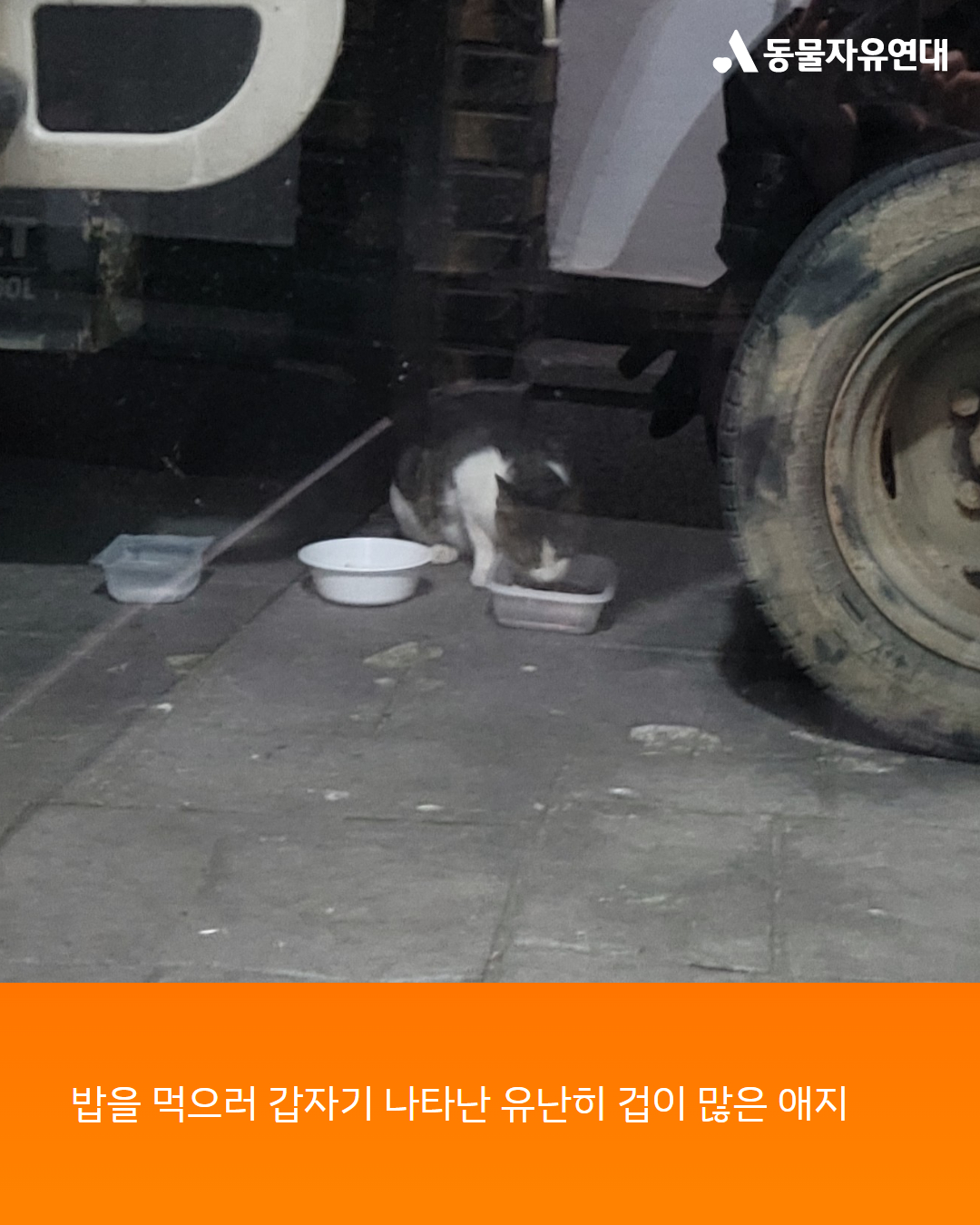 밥을 챙겨주는 시간을 귀신같이 알고는 담벼락이나 차 아래에서 얌전하게 기다리고 있었습니다. ‘애지’라고 부르는 그 고양이는 겁이 많고 예민했습니다. 다가가면 뒷걸음질