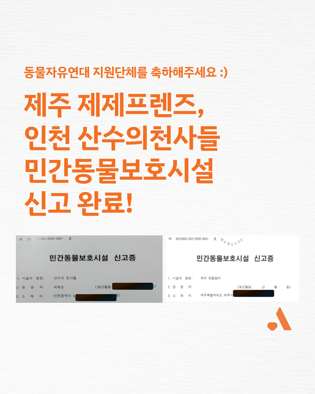 각각 2025년 12월 31일, 2026년 1월 26일에 지자체에 민간동물보호시설 신고를 완료했습니다!