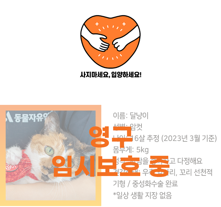고양이의 수명은 15년에서 20년입니다. 사랑하는 반려동물과 최대한 오래 함께하고 싶은 마음은 누구나 같을 것입니다. 하지만 고양이 친구들이 남은 생을 보호소가 아님 가족의 품에서 보낼 수 있게 함께 해주세요.