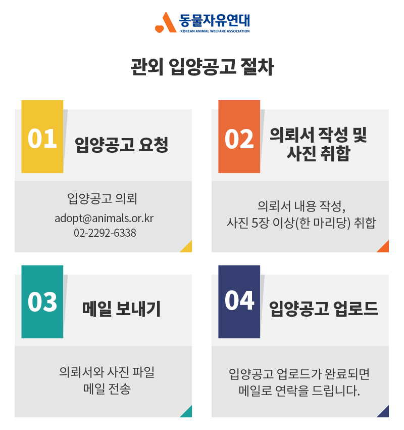 1. 입양 공고 요청은 adopt@animals.or.kr 또는 02-2292-6338로 요청하시면 메일로 '외부입양의뢰서'를 보내드립니다.