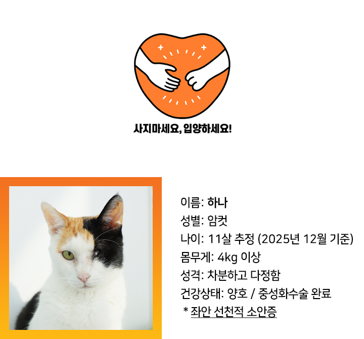 한쪽 눈으로도 세상을 따뜻하게 바라보는 하나에게 더 큰 세상을 안겨 줄 가족이 찾아오기를 바랍니다. 🏠️