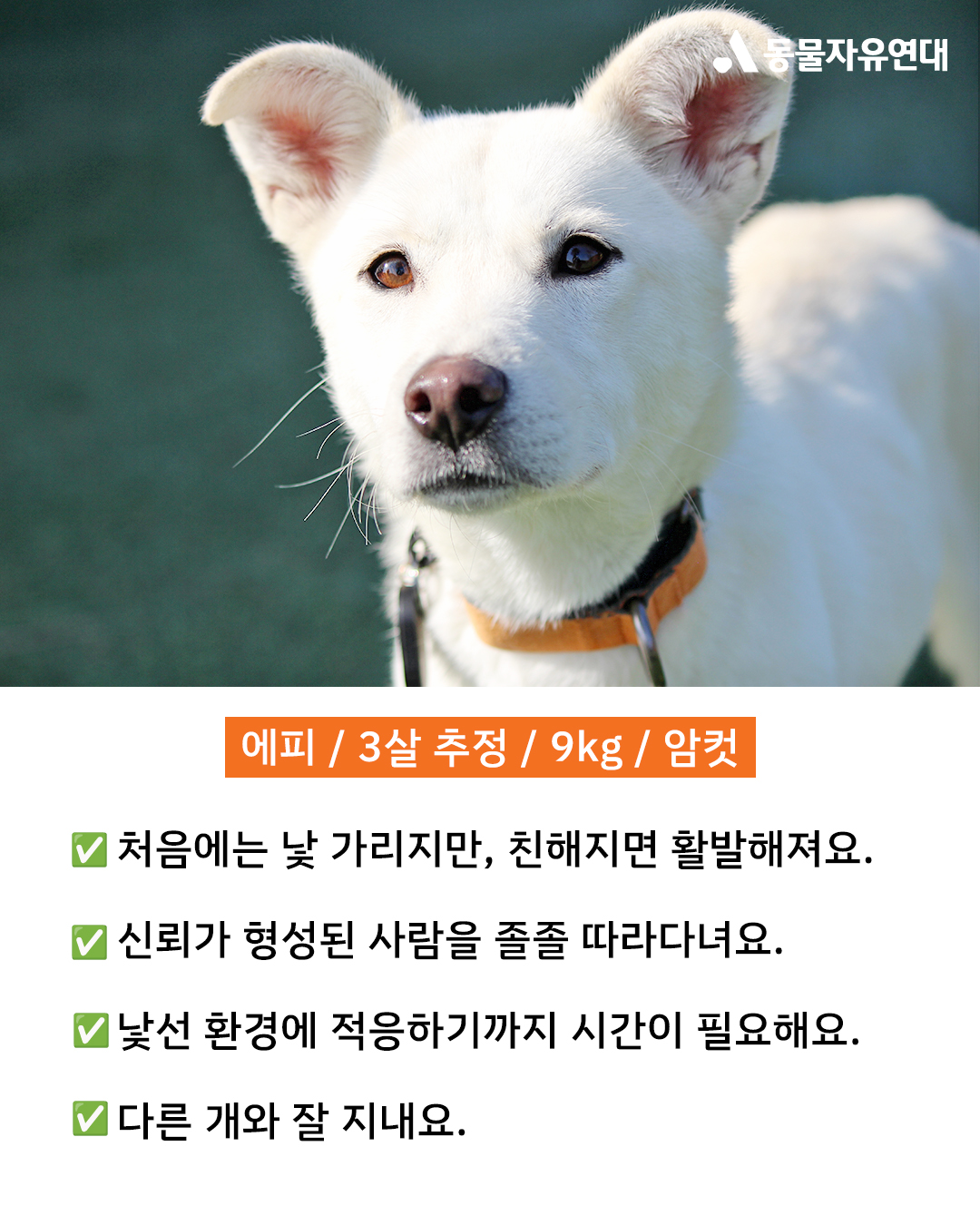 에피처럼 소심하고 겁이 많은 성격의 개도 충분히 가정에서 행복하게 지낼 수 있습니다. 에피 같은 친구는 한번 안정감을 느끼면 더욱 깊은 애정을 보여주곤 합니다. 천천히 적응할 시간과 인내심만 가져준다면, 어느새 가족과 함께 평범한 일상을 함께 만들어갈 수 있을 것입니다.😌