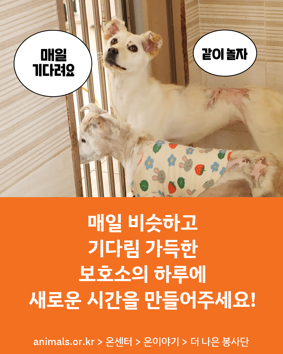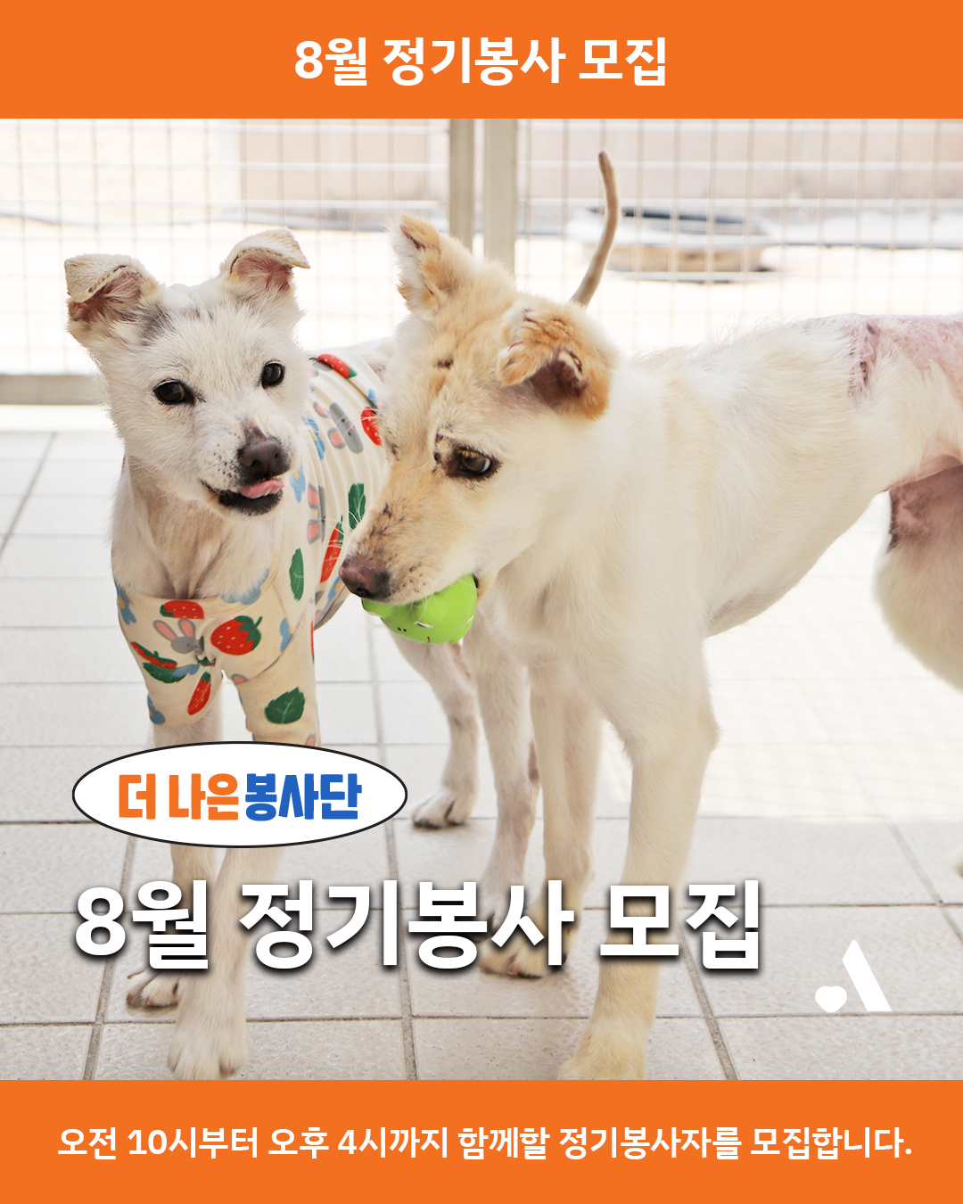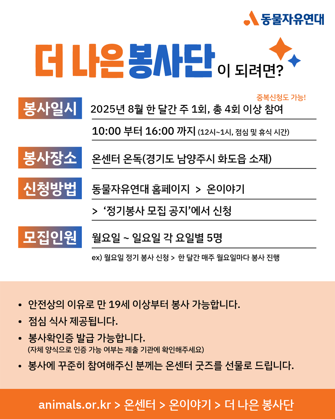 ’더 나은 봉사단‘은 온센터 보호 동물들의 더 나은 삶을 위한 활동을 합니다. 환경 개선, 놀이 활동, 교감을 통해 동물들의 삶을 바꾸어 나갑니다. 2025년 8월 한 달 동안 온센터 동물들과 함께 시간을 보내주세요!