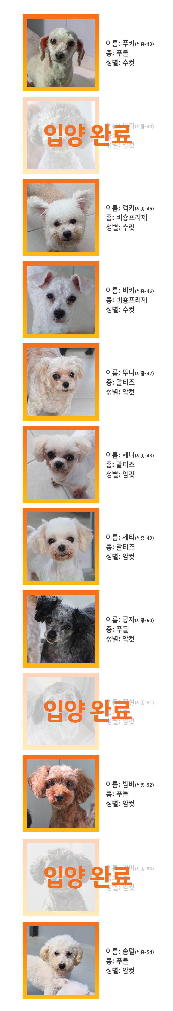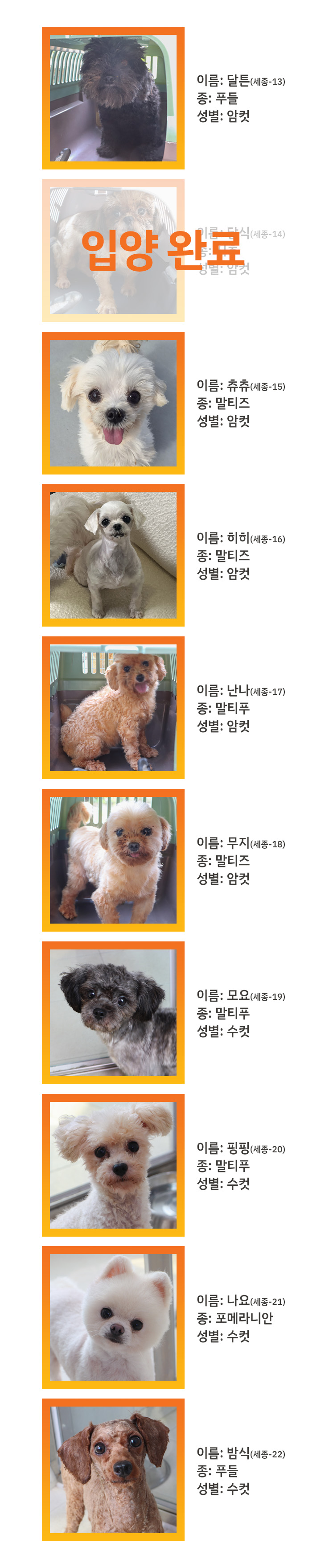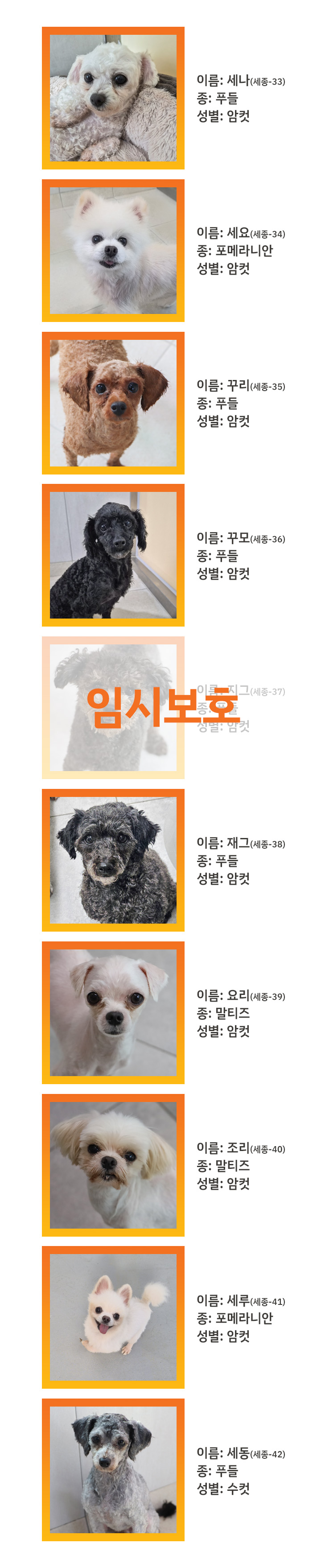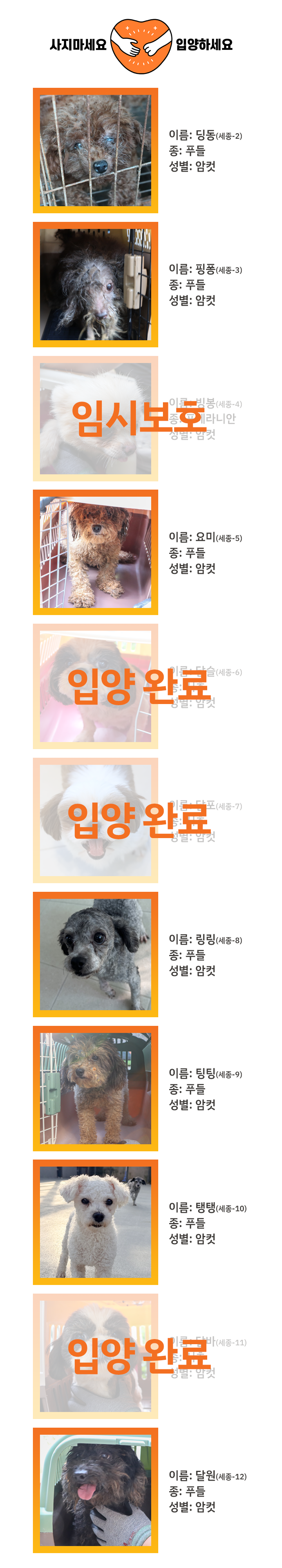 💡 소개된 동물의 세부적인 정보를 한 마리 한 마리 자세히 안내해 드리기 어려운 점 양해 부탁드립니다. (현재 구조견 모두 미용과 목욕, 전염병 검사, 기본 건강검진, 예방접종, 중성화 수술을 진행하고 있습니다.)