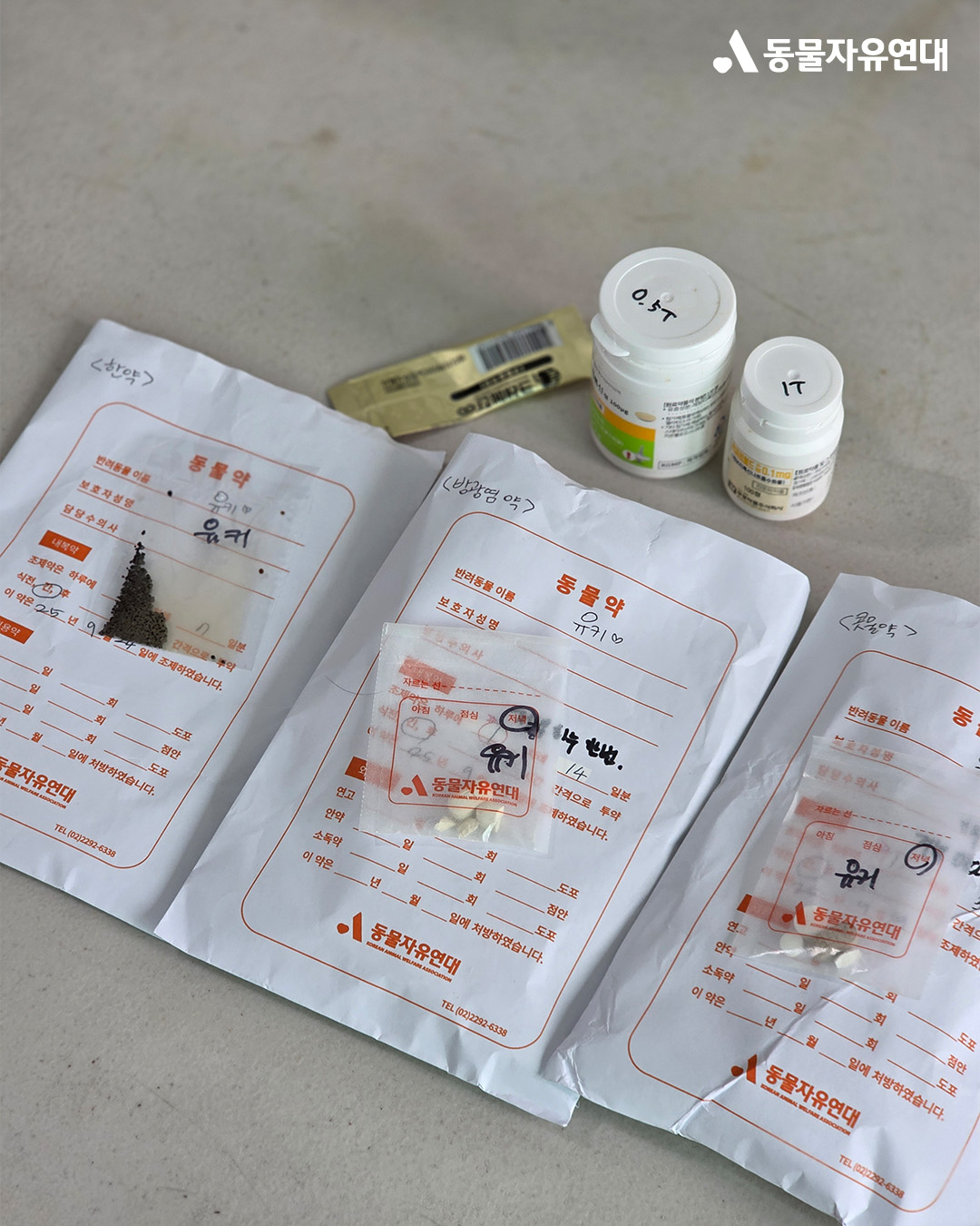 최근에는 유키가 남은 노년을 조금이라도 더 수월하고 편안하게 보낼 수 있기를 바라는 마음으로 한방 치료를 시작했습니다. 한약을 복용하고, 침 치료도 병행하고 있어요.