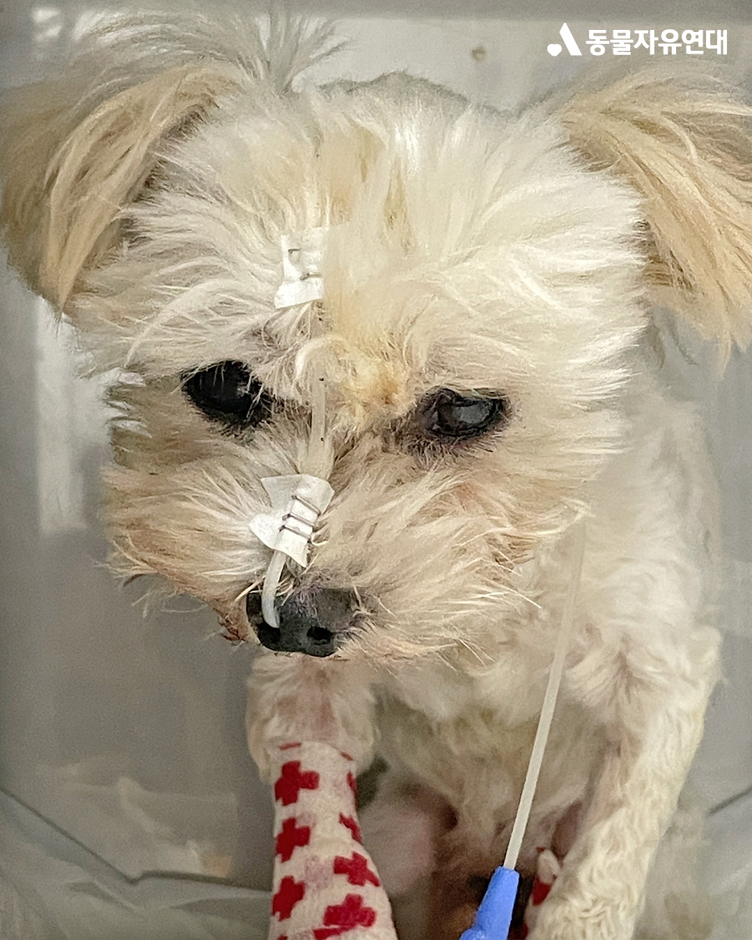 구조 당시 뚜솜이의 작은 몸은 성한 데가 없을 만큼 고통의 흔적을 품고 있었습니다. 오른쪽 눈은 각막 손상으로 흐려져 있었고, 무릎은 불안정하게 흔들렸으며, 치석과 내장 질환, 생식기 손상까지…. 뚜솜이의 몸 구석구석은 그간 뚜솜이가 어떤 시간을 살아왔는지 보여주고 있었습니다. 도구처럼 쓰이다 남겨진 삶의 상처들이었습니다.
