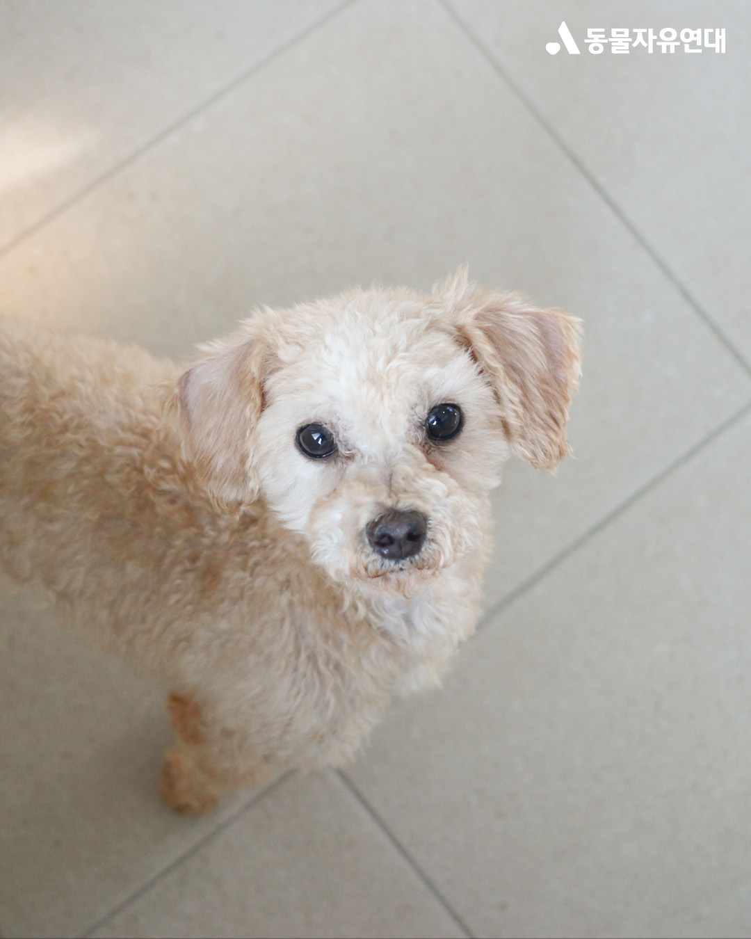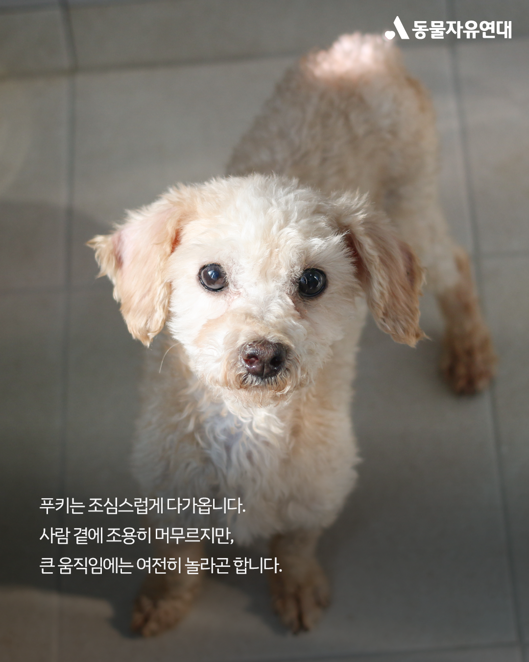 푸키는 온센터의 돌봄 속에서 많은 것들을 씻어냈습니다. 수컷, 갈색 모색의 푸들. 구조 당시 기록과 달리 푸키는 부드럽고 밝은 모색을 가지고 있습니다. 또 인기척만으로 몸을 굳히던 비키는 조금씩 두려움도 지워냈습니다.