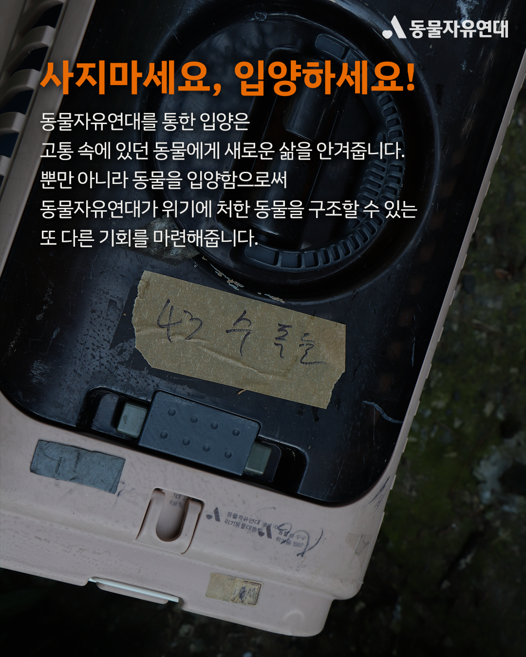 43번째로 품에 안겨 뜬장에서 나와, 온전한 땅을 밟았습니다. 그렇게 세종-43이 되었습니다. 구조 순서로 번호를 부여받기 전, 이들은 이름이 없었습니다. 그곳에는 이름도, 생명도 존재하지 않았습니다. 단지 가위질 연습과 번식을 위한 도구만이 있었습니다. 작은 몸으로 수많은 상처를 안은 채, 실습과 번식이라는 제 쓰임과 용도를 다하기 위해 사용되어야 했습니다.
