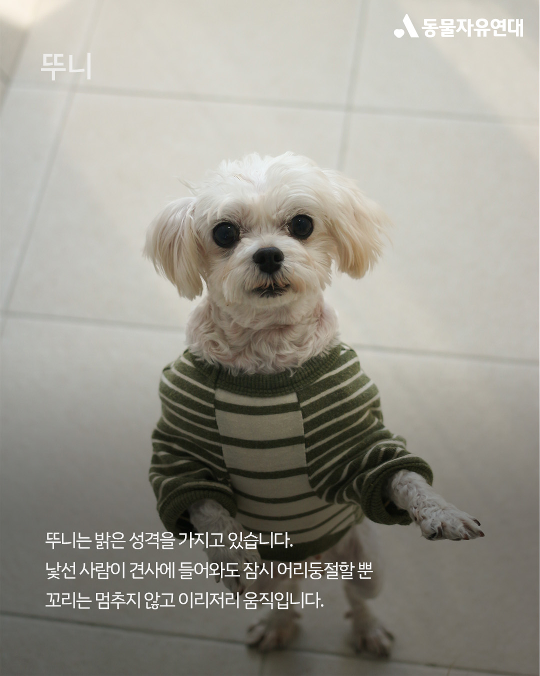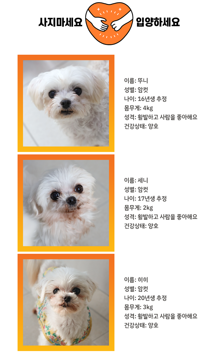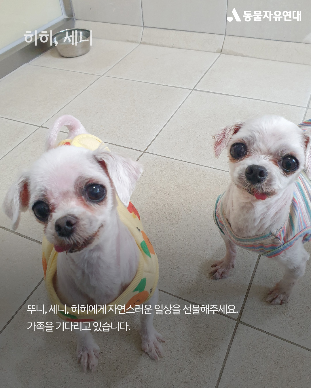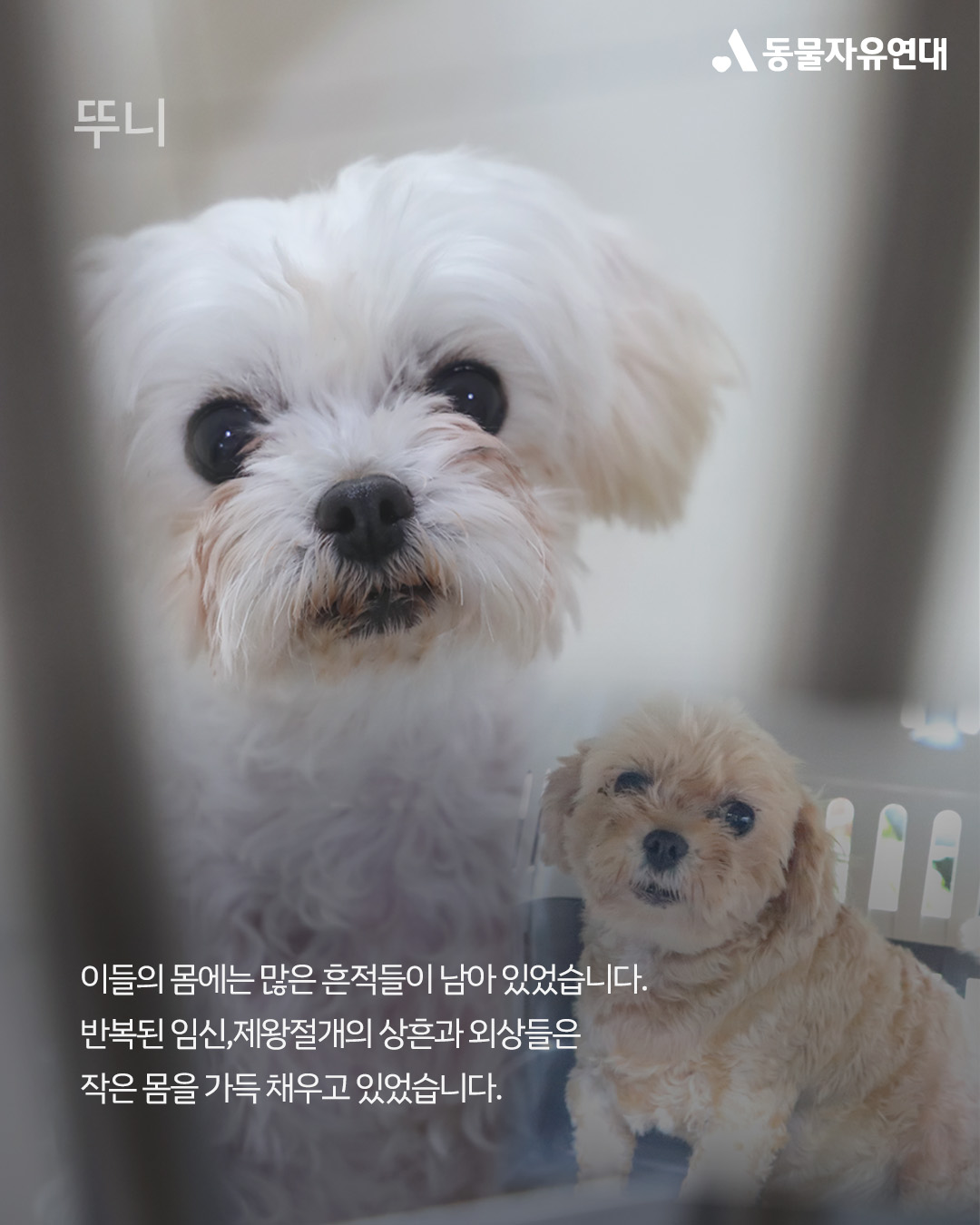 뜬장과 실습대를 벗어난 이들이 다정한 가족의 품을 알게 되는 날을 기다리고 있습니다. 이들에게 자연스러운 삶을 선물해주세요. 사지마세요, 입양하세요.