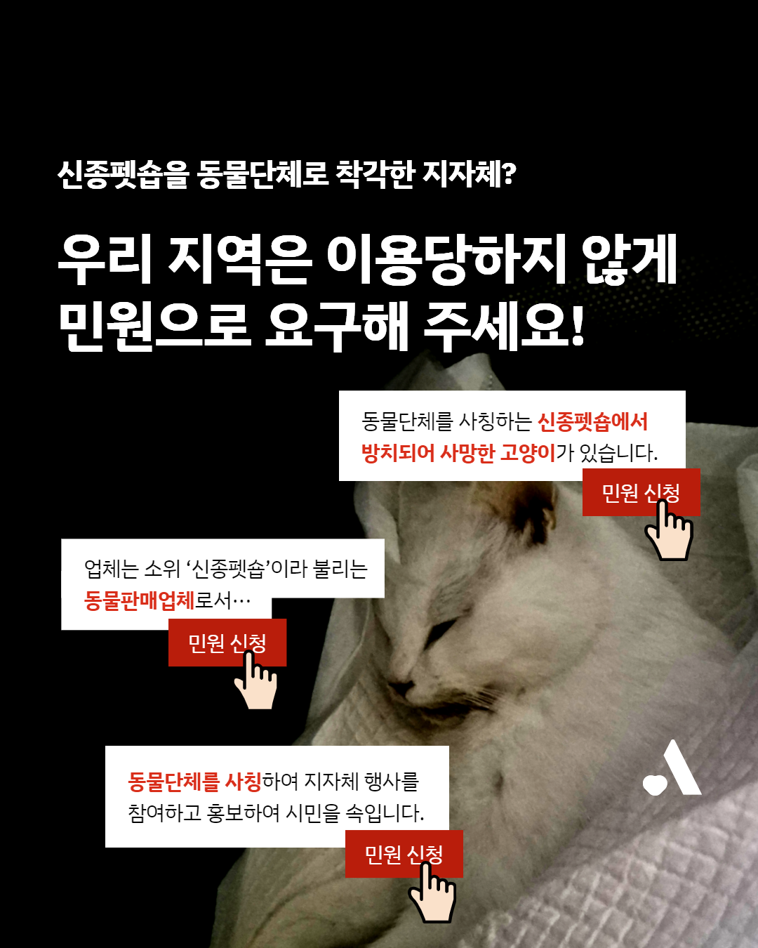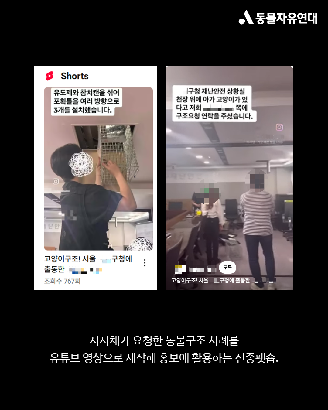 작년 말, 서울시 한 지자체는 신종펫숍에 새끼 고양이 구조를 요청했습니다. 업체는 해당 건을 홈페이지에 게시하고 유튜브 쇼츠로 만드는 등 자사를 동물단체로 홍보하는 데 지자체 구조 건을 이용하고 있습니다. 신종펫숍 규제에 힘써야 할 지자체가 도리어 신종펫숍의 위장 영업에 힘을 실어준 것입니다.