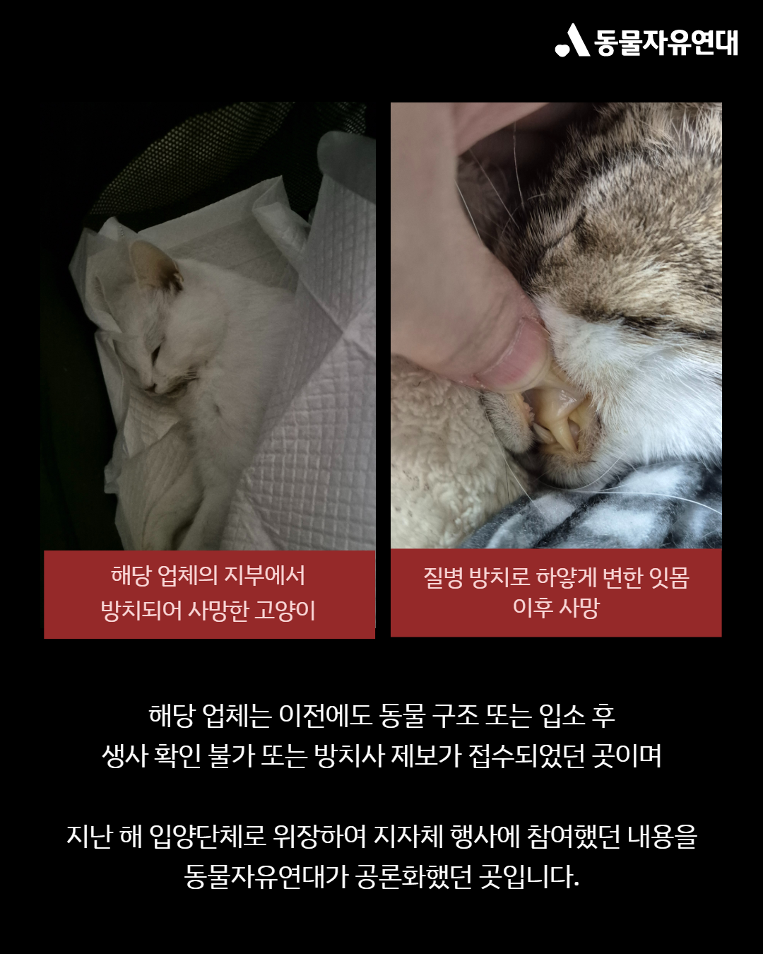 해당 업체는 전국에 여러 지부를 운영하는 곳으로서 동물자유연대는 여러 영업장에서 일어나는 동물 방치, 행방불명 등의 제보를 접수받았습니다. 따라서 이 업체가 지자체에서 구조한 고양이 역시 안전을 장담할 수 없습니다. 게다가 더 큰 문제는 이 같은 일이 다른 지자체에서도 계속 이루어질 우려가 높다는 점입니다.