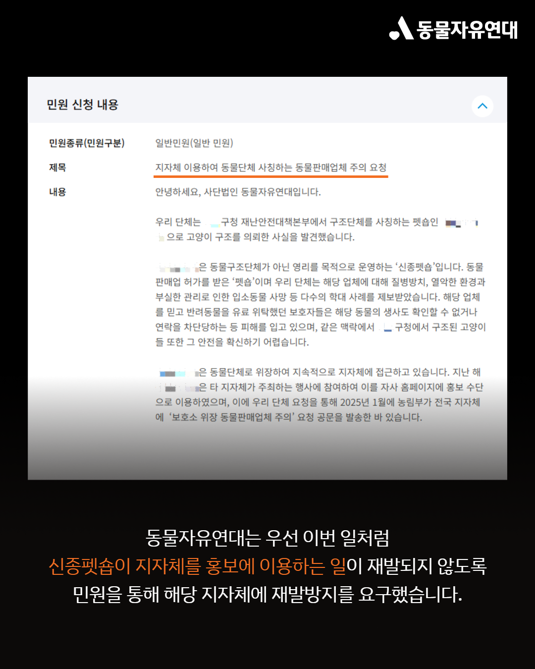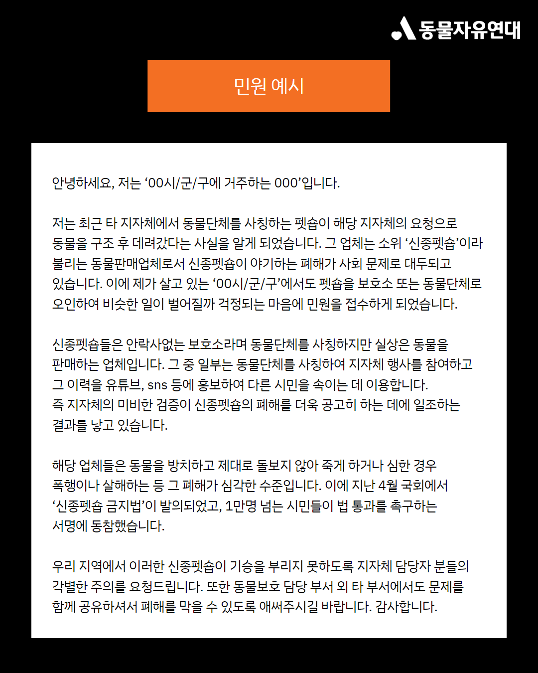 저는 최근 타 지자체에서 동물단체를 사칭하는 펫숍이 해당 지자체의 요청으로 동물을 구조 후 데려갔다는 사실을 알게 되었습니다. 그 업체는 소위 ‘신종펫숍’이라 불리는 동물판매업체로서 신종펫숍이 야기하는 폐해가 사회 문제로 대두되고 있습니다. 이에 제가 살고 있는 ‘00시/군/구’에서도 펫숍을 보호소 또는 동물단체로 오인하여 비슷한 일이 벌어질까 걱정되는 마음에 민원을 접수하게 되었습니다.