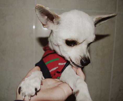 이름&전화번호가 적힌 은색 뼈다귀 목걸이를 차고 있음.