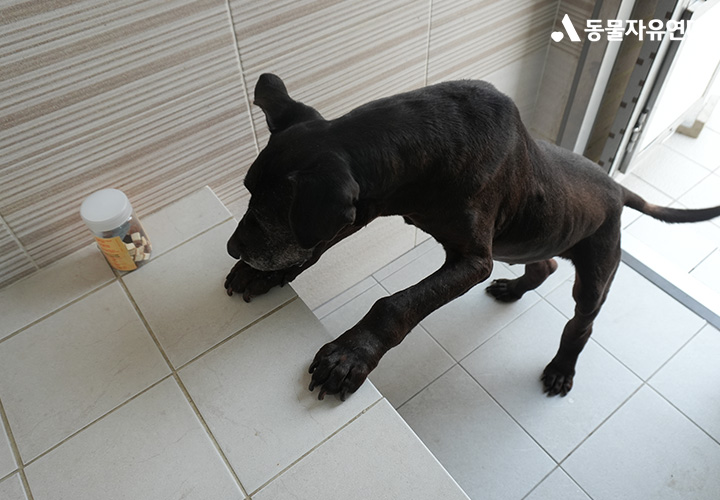 두유의 다리에는 종양이 번져 퉁퉁 부었고, 예전처럼 산책을 나가는 것도 이제는 힘에 부쳐 하는 모습입니다. 현재는 통증 패치를 통해 아픔을 조금이나마 덜어주며, 두유가 조금이라도 평온할 수 있도록 곁을 지키고 있습니다.