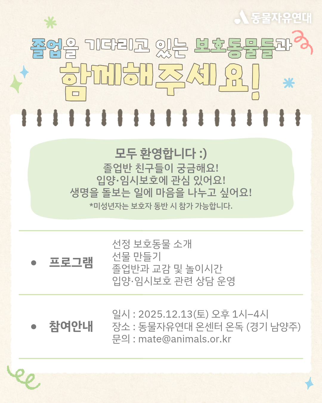 졸업을 기다리는 보호동물들의 일일 선생님으로, 든든한 가족으로, 따뜻한 친구로 함께해주세요!