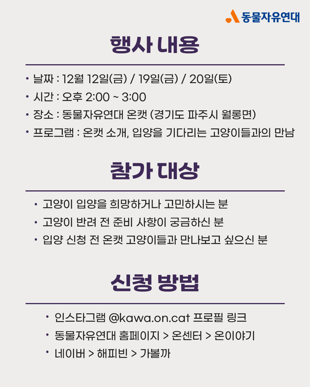· 프로그램: 온캣 소개, 입양을 기다리는 고양이들과의 만남