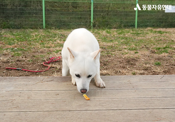 팔금이는 이제 익숙한 방 안에서는 먼저 꼬리를 힘껏 흔들고 온몸으로 반가움을 표현하며 다가옵니다. 넓은 운동장에서도 예전보다 훨씬 용감해져, 조심스러운 발걸음으로 다가와 건네는 간식까지 받아먹는 기특한 변화를 보이고 있습니다.