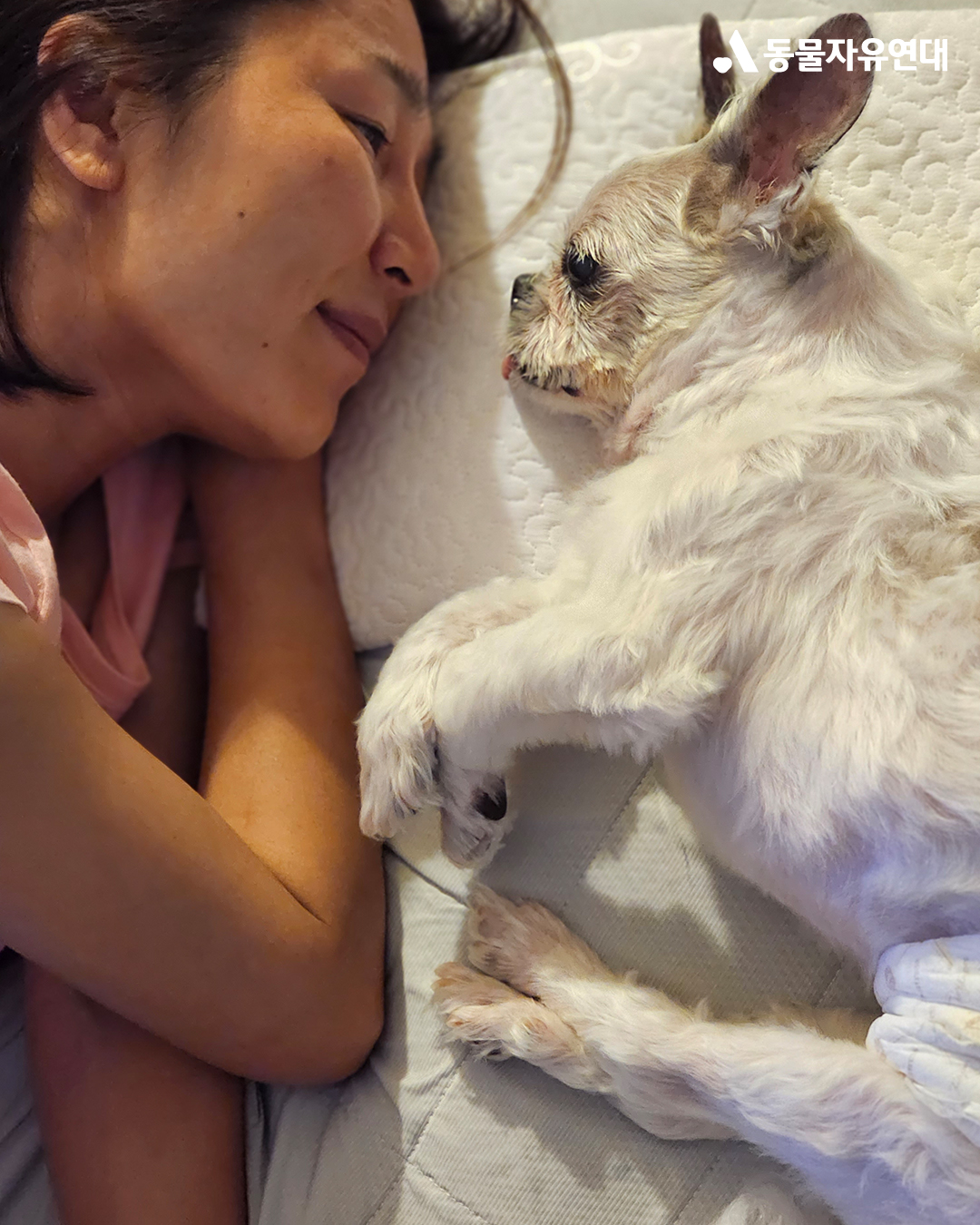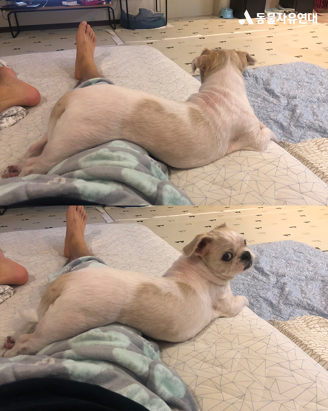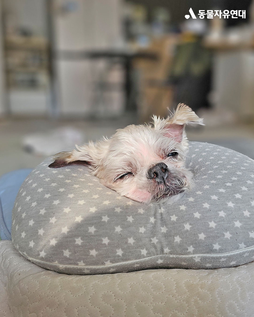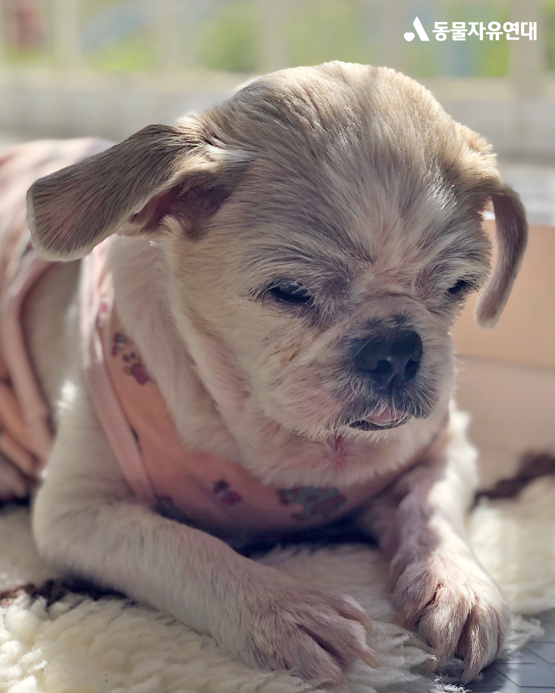 늘 고집 세고 한 성질 했던 탱이에게도 나이가 들면서 여러 병과 노화의 속도가 찾아왔습니다. 담낭점액종으로 담낭을 제거하는 수술을 견디기도 했고, 이후에는 원인을 알 수 없는 신경 증세로 신체가 굳어 사지마비 상태가 찾아왔습니다. 지난 2년여의 시간 동안 탱이는 스스로 움직일 수 없었기에 자세를 자주 바꿔주어야 했고, 배뇨와 배변 역시 사람의 손길이 필요했습니다.