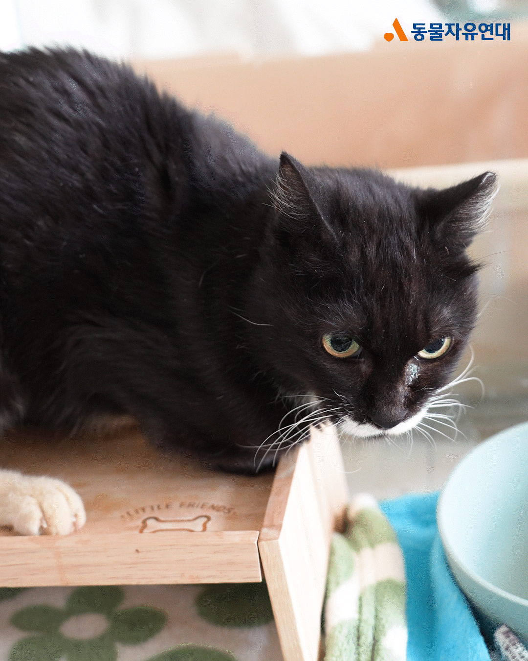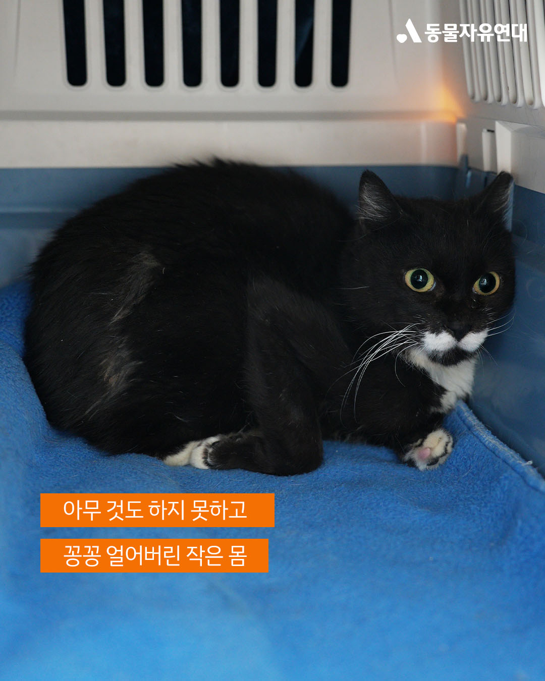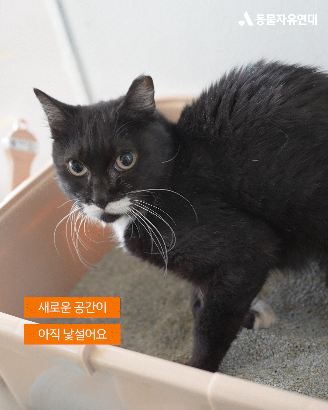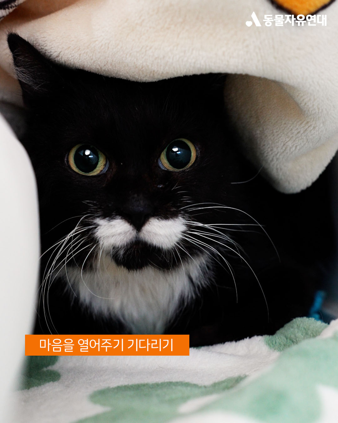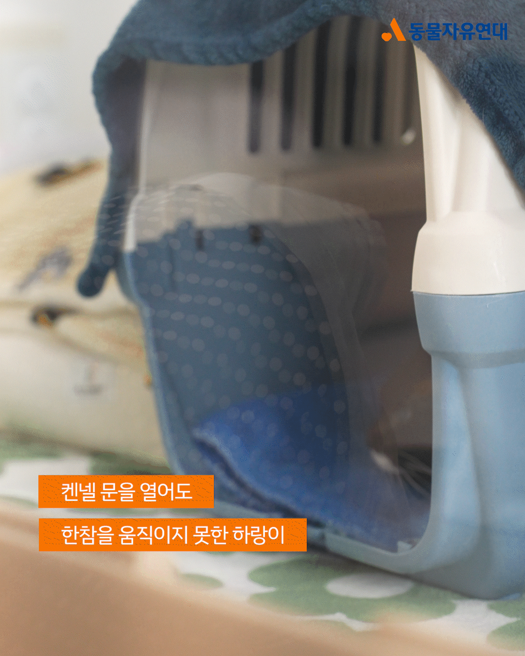 퇴원 후 온캣에 입주한 첫날, 하랑이는 두려움에 움직이지 못했습니다. 켄넬 문을 열어주어도 한참을 나오지 못하다가, 활동가가 자리를 비워주자 그제야 조심스레 밖으로 발을 내디뎠습니다. 하지만 이내 낯선 환경에 담요 밑으로 숨어버린 하랑이는 눈을 동그랗게 뜨고 꼼짝없이 굳어버렸습니다.