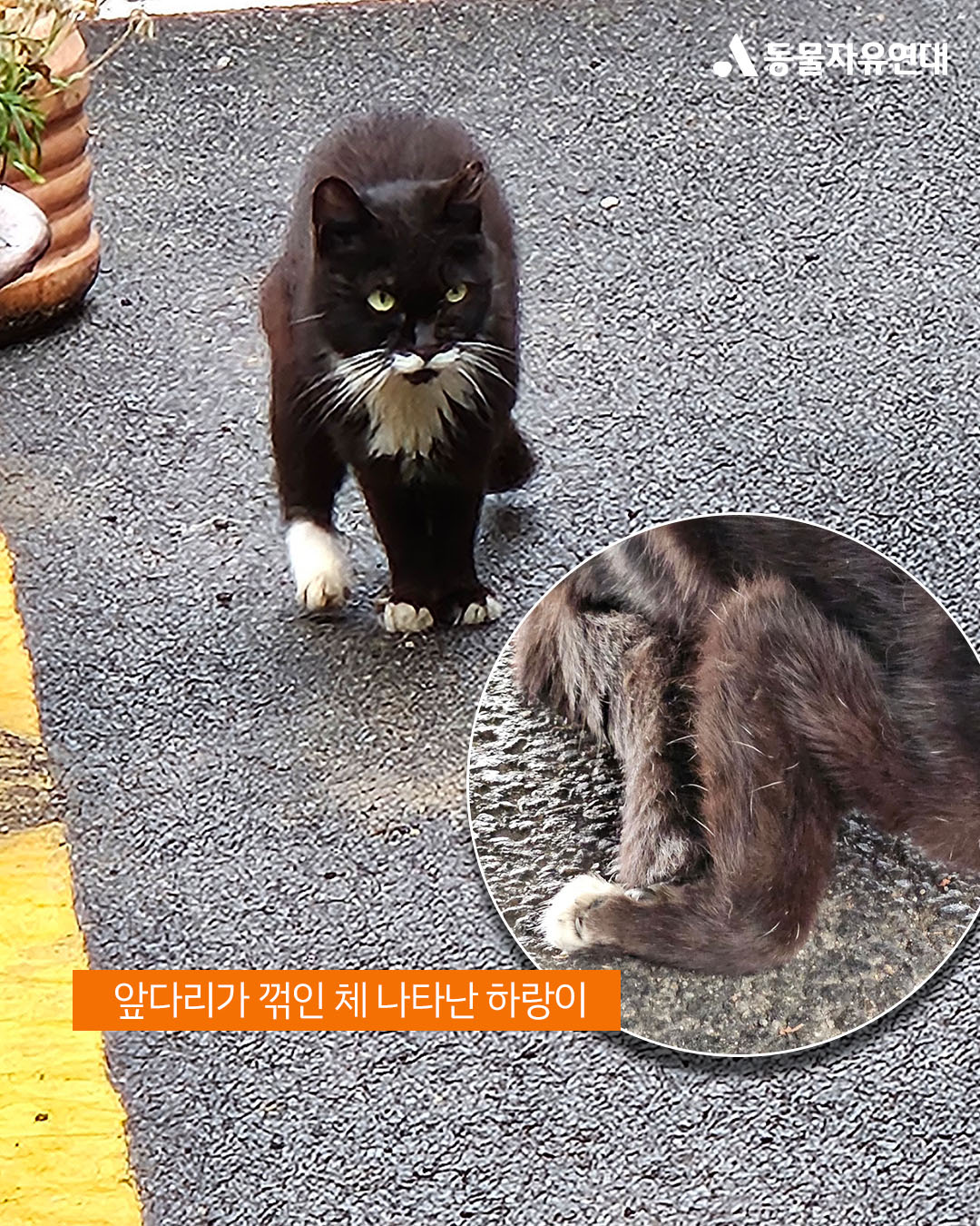 하랑이는 길 위에서 챙겨주는 밥을 먹으러 오던 평범한 길고양이였습니다. 그러던 어느 날부터 하랑이가 갑자기 모습을 보이지 않았습니다. 한 달 만에 돌아온 하랑이는 오른쪽 앞다리가 심하게 꺾인 상태였습니다.