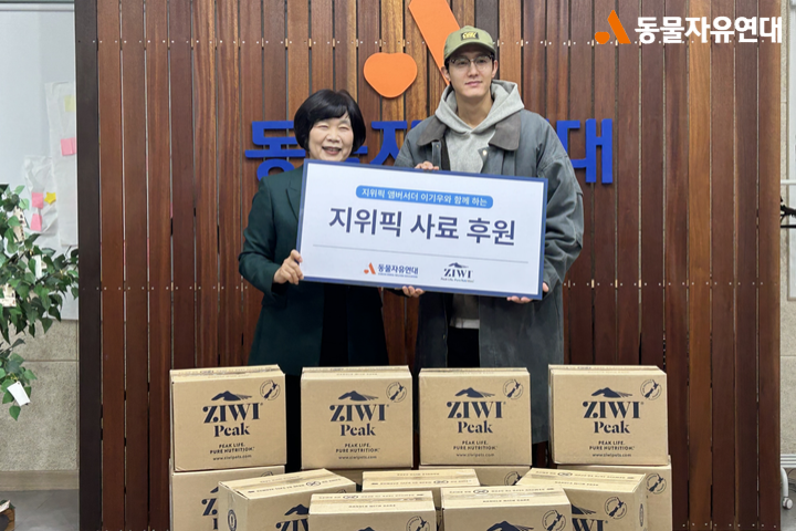 윤리적이고 지속가능한 방법으로 얻은 원료만으로 사료를 만드는 지위픽에서 동물자유연대로 사료를 보내주셨습니다.