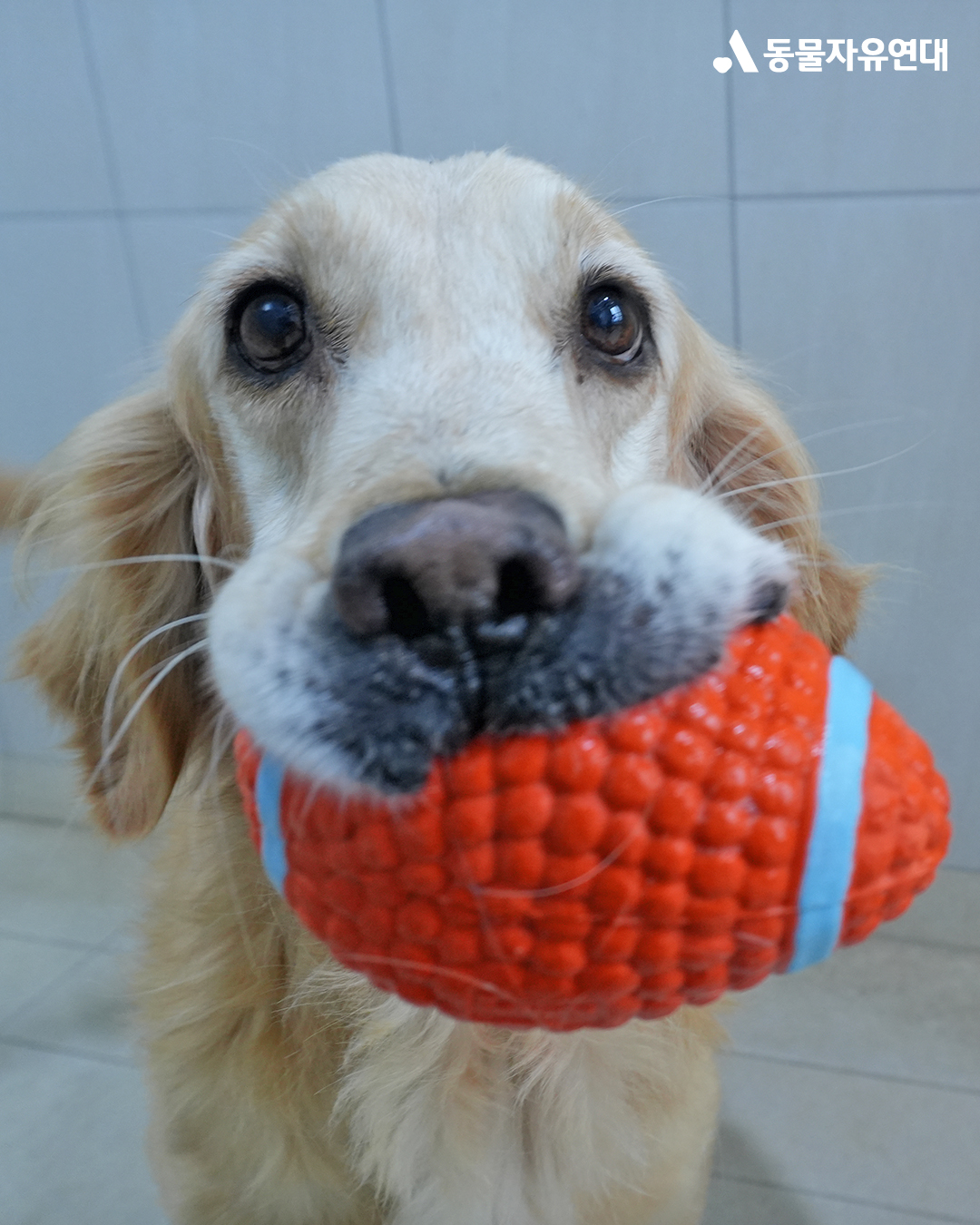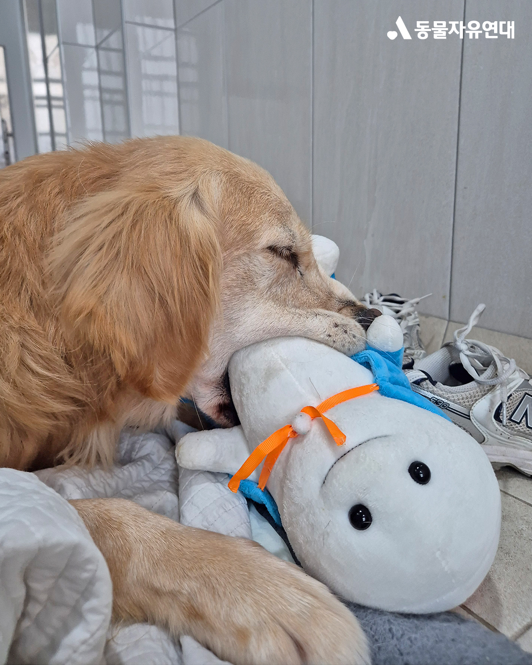 번식장의 뜬장에서 끊임없이 빙글빙글 돌며 울부짖던 리프는 구조된 후 좋아하는 것들을 찾아갔습니다. 장난감을 절대 놓고 싶지 않아 하고, 장난감이 없으면 활동가의 팔과 이불이라도 입에 물고서 안정을 찾았습니다. 뜬장 안에서 돌봄도, 좋아하는 것도 허락되지 않던 삶에서 벗어나, 리프는 자신이 붙잡을 수 있는 것들을 배워갔습니다.