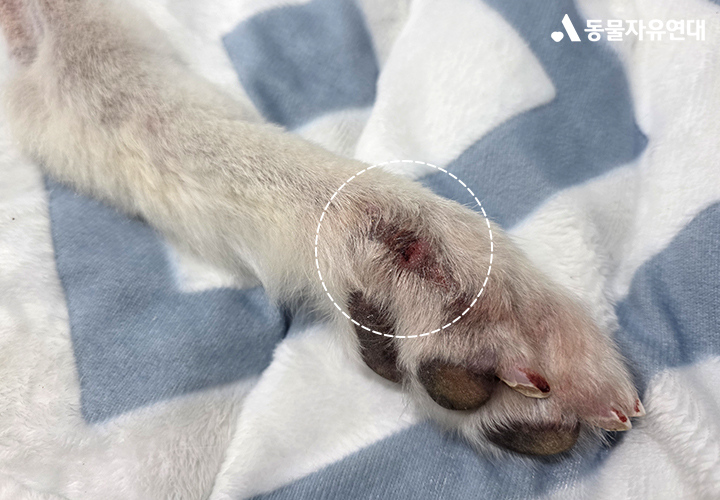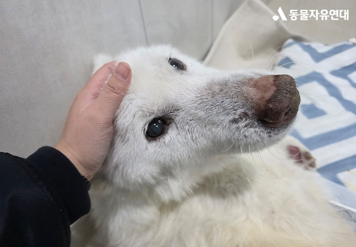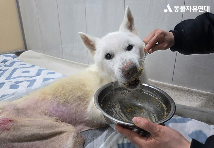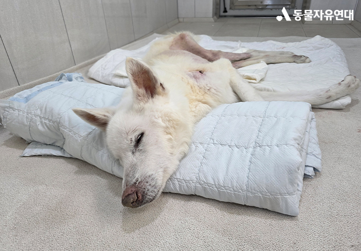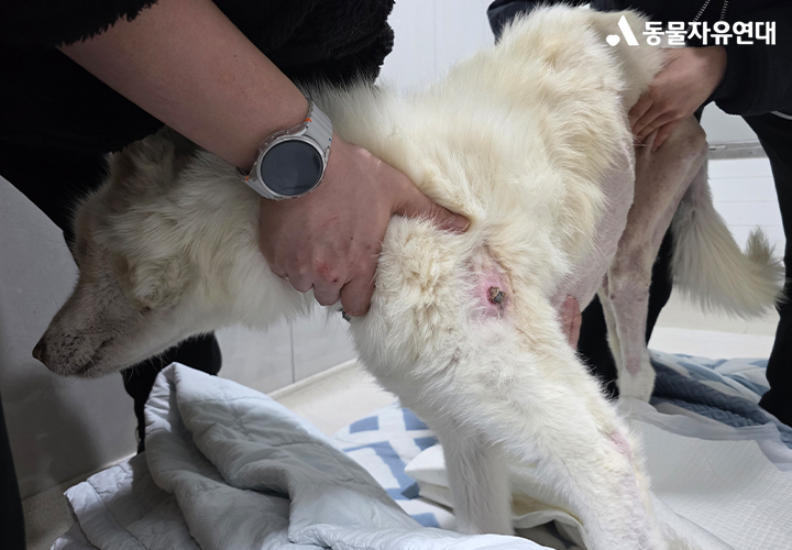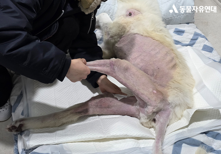 스스로 일어나지 못해 밤사이 누운 채로 배뇨를 하게 되어, 강단이가 그대로 누워 있는 시간이 길어지지 않도록 활동가들이 퇴근 전에 압박 배뇨로 도움을 주고 있습니다.